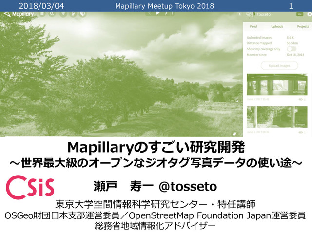 2018/03/04 Mapillary Meetup Tokyo 2018 1 Mapillaryのすごい研究開発 〜世界最大級のオープンなジオタグ写真データの使い途〜 瀬戸 寿一