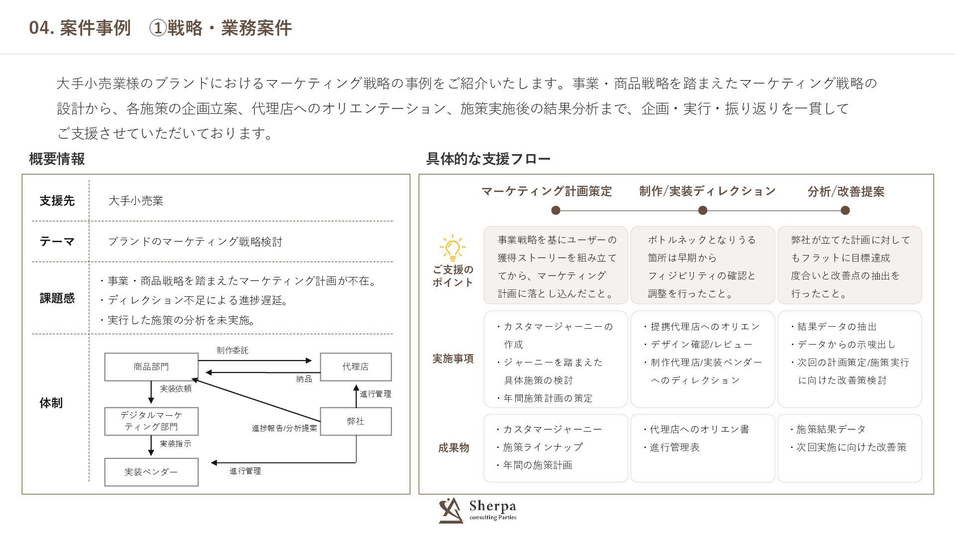 支援先 大手小売業 テーマ ブランドのマーケティング戦略検討 課題感 ・事業・商品戦略を踏まえたマーケティング計画が不在。 ・ディレクション不足による進捗遅延。 ・実行した施策の分析を未実施。 体制 04.