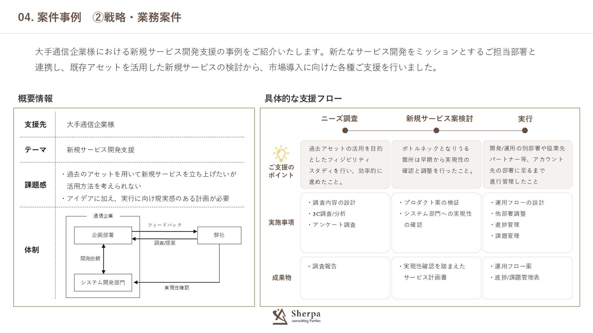 案件事例 ②戦略・業務案件 ニーズ調査 新規サービス案検討 実行 ご支援の ポイント ・調査内容の設計 ・3C調査/分析 ・アンケート調査 ・プロダクト案の検証 ・システム部門への実現性 の確認 ・運用フローの設計 ・他部署調整 ・進捗管理 ・課題管理 実施事項 ・調査報告 ・実現性確認を踏まえた サービス計画書 ・運用フロー案 ・進捗/課題管理表 成果物 概要情報 具体的な支援フロー 大手通信企業様における新規サービス開発支援の事例をご紹介いたします。新たなサービス開発をミッションとするご担当部署と 連携し、既存アセットを活用した新規サービスの検討から、市場導入に向けた各種ご支援を行いました。 企画部署 弊社 システム開発部門 フィードバック 調査/提案 開発依頼 実現性確認 通信企業 過去アセットの活用を目的 としたフィジビリティ スタディを行い、効率的に 進めたこと。 ボトルネックとなりうる 箇所は早期から実現性の 確認と調整を行ったこと。 開発/運用の別部署や協業先 パートナー等、アカウント 先の部署に至るまで 進行管理したこと