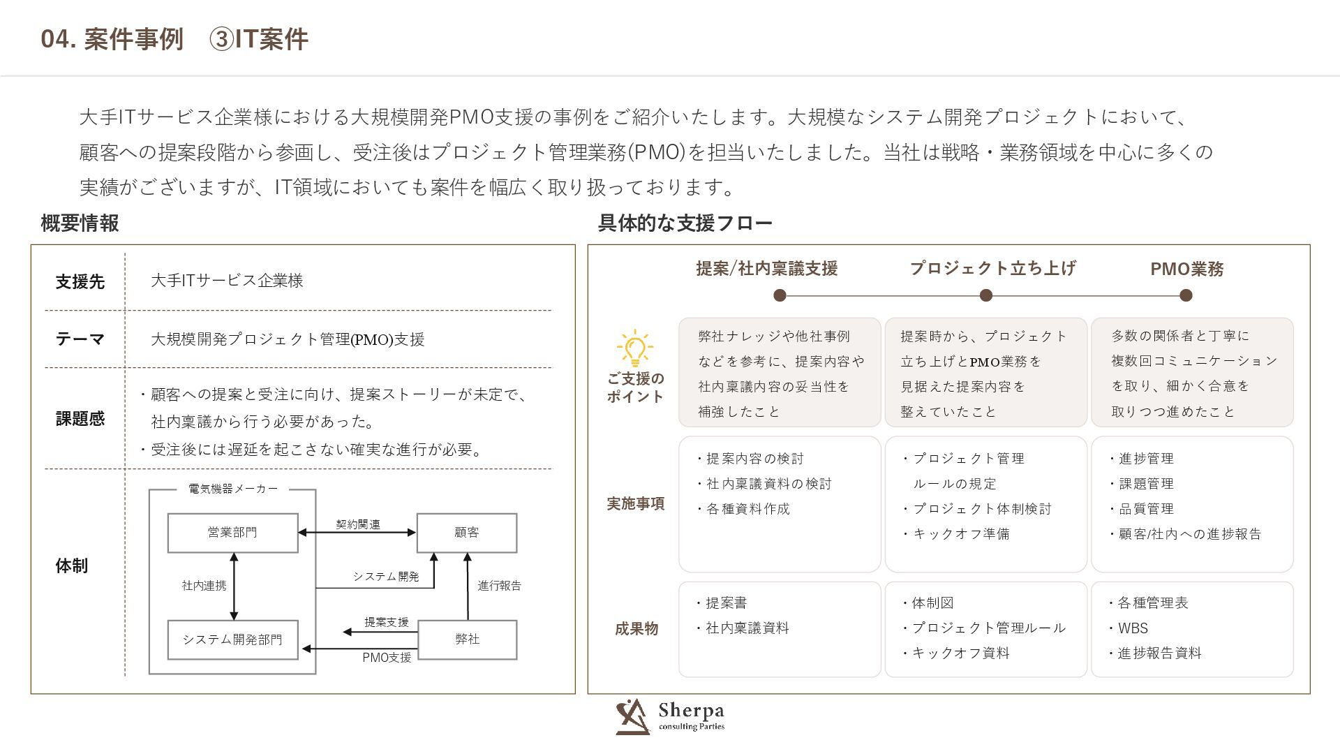 支援先 大手ITサービス企業様 テーマ 大規模開発プロジェクト管理(PMO)支援 課題感 ・顧客への提案と受注に向け、提案ストーリーが未定で、 社内稟議から行う必要があった。 ・受注後には遅延を起こさない確実な進行が必要。 体制 04.