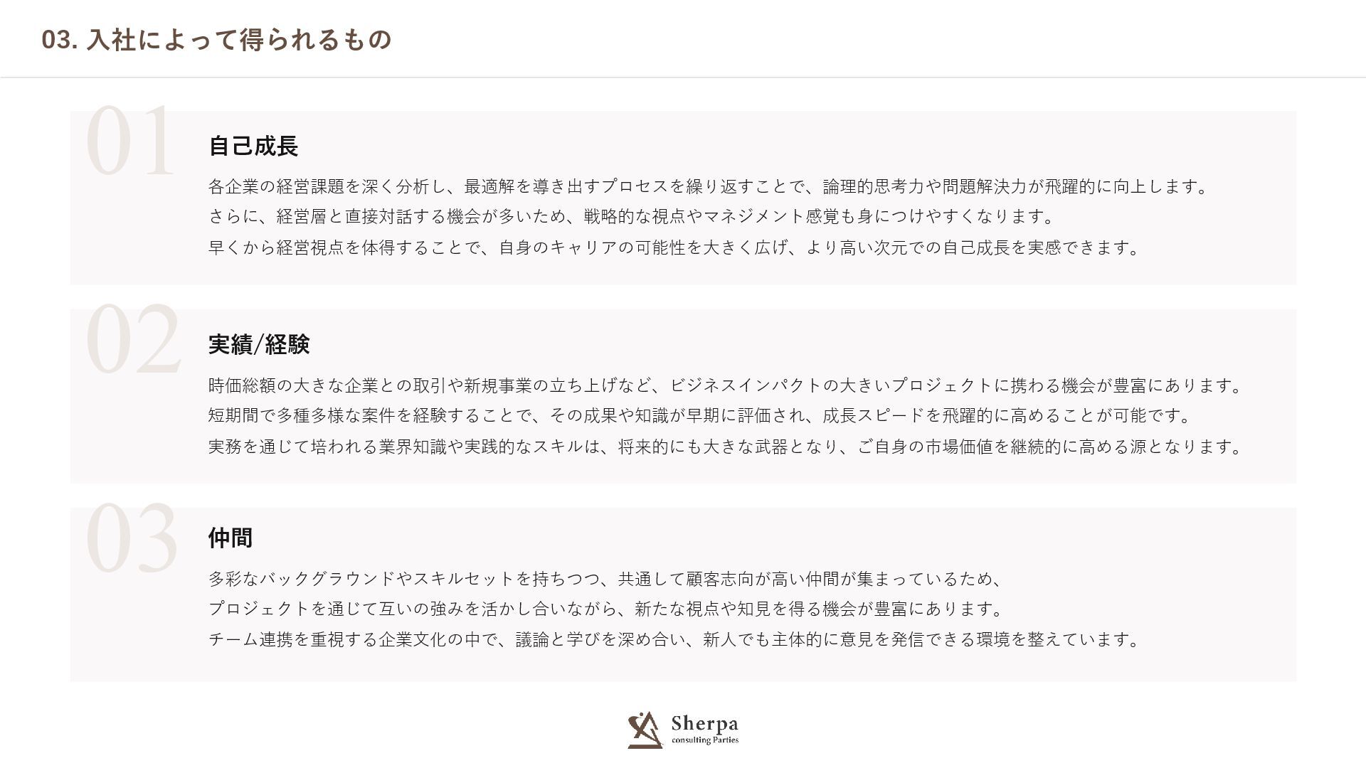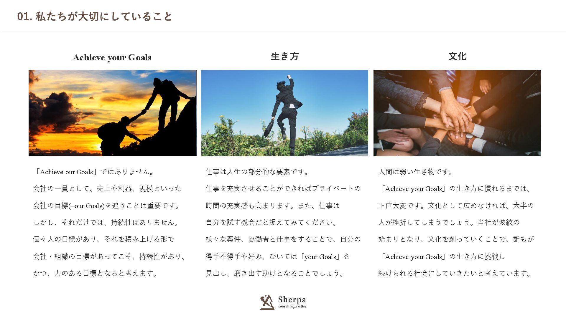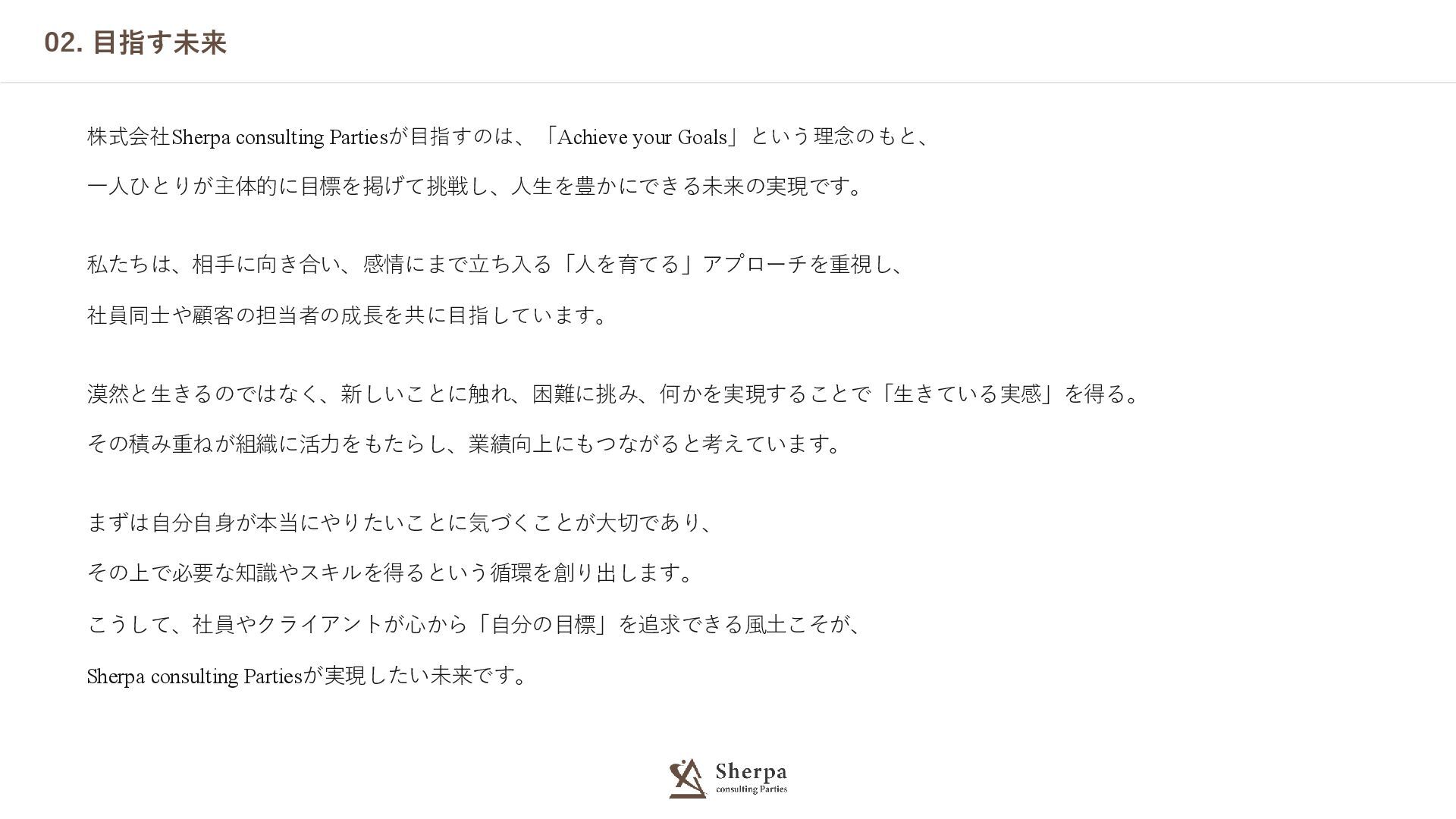 02. 目指す未来 株式会社Sherpa consulting Partiesが目指すのは、「Achieve your Goals」という理念のもと、 一人ひとりが主体的に目標を掲げて挑戦し、人生を豊かにできる未来の実現です。 私たちは、相手に向き合い、感情にまで立ち入る「人を育てる」アプローチを重視し、 社員同士や顧客の担当者の成長を共に目指しています。