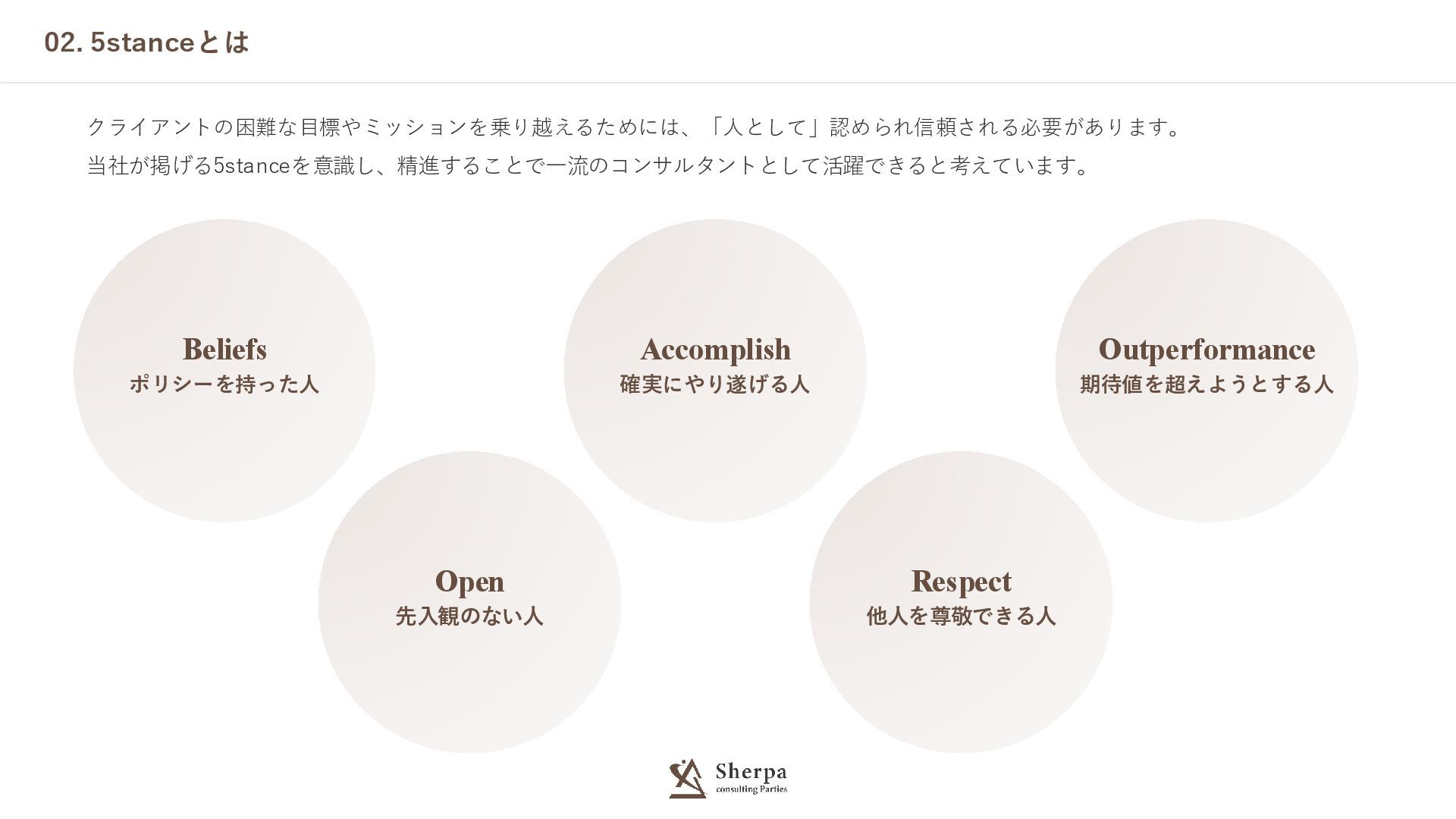 02. 5stanceとは クライアントの困難な目標やミッションを乗り越えるためには、「人として」認められ信頼される必要があります。 当社が掲げる5stanceを意識し、精進することで一流のコンサルタントとして活躍できると考えています。 ポリシーを持った人 Beliefs 確実にやり遂げる人 Accomplish 期待値を超えようとする人 Outperformance