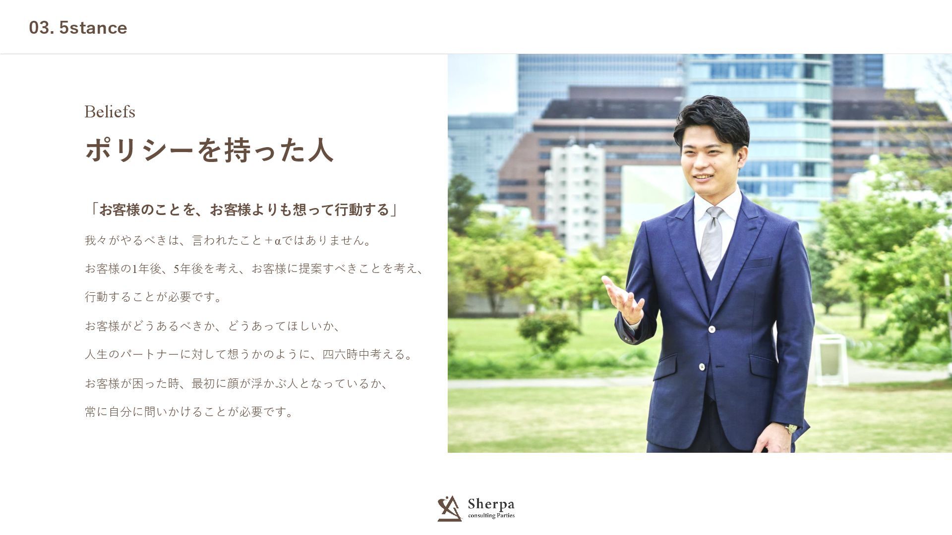 03. 5stance Beliefs ポリシーを持った人 「お客様のことを、お客様よりも想って行動する」 我々がやるべきは、言われたこと+αではありません。 お客様の1年後、5年後を考え、お客様に提案すべきことを考え、 行動することが必要です。 お客様がどうあるべきか、どうあってほしいか、 人生のパートナーに対して想うかのように、四六時中考える。