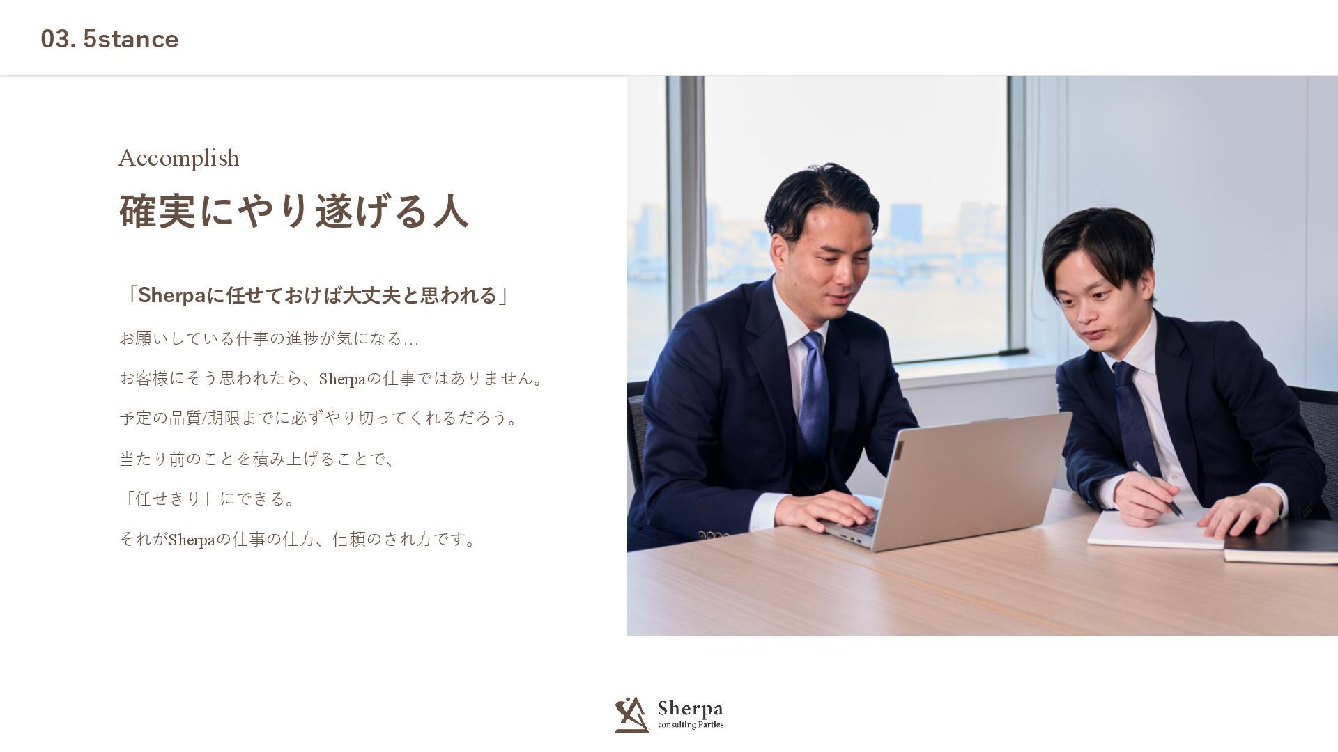 03. 5stance Accomplish 確実にやり遂げる人 「Sherpaに任せておけば大丈夫と思われる」 お願いしている仕事の進捗が気になる… お客様にそう思われたら、Sherpaの仕事ではありません。 予定の品質/期限までに必ずやり切ってくれるだろう。 当たり前のことを積み上げることで、 「任せきり」にできる。
