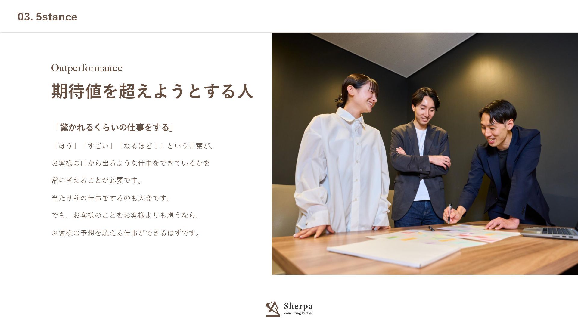03. 5stance Outperformance 期待値を超えようとする人 「驚かれるくらいの仕事をする」 「ほう」「すごい」「なるほど!」という言葉が、 お客様の口から出るような仕事をできているかを 常に考えることが必要です。 当たり前の仕事をするのも大変です。 でも、お客様のことをお客様よりも想うなら、