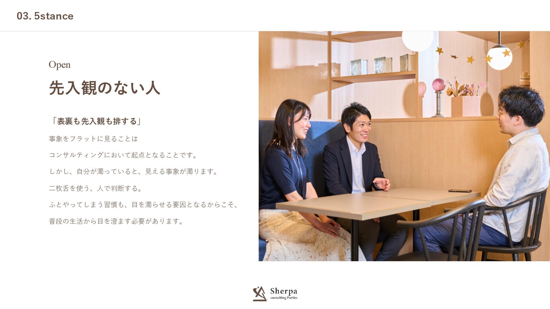 03. 5stance Open 先入観のない人 「表裏も先入観も排する」 事象をフラットに見ることは コンサルティングにおいて起点となることです。 しかし、自分が濁っていると、見える事象が濁ります。 二枚舌を使う、人で判断する。 ふとやってしまう習慣も、目を濁らせる要因となるからこそ、