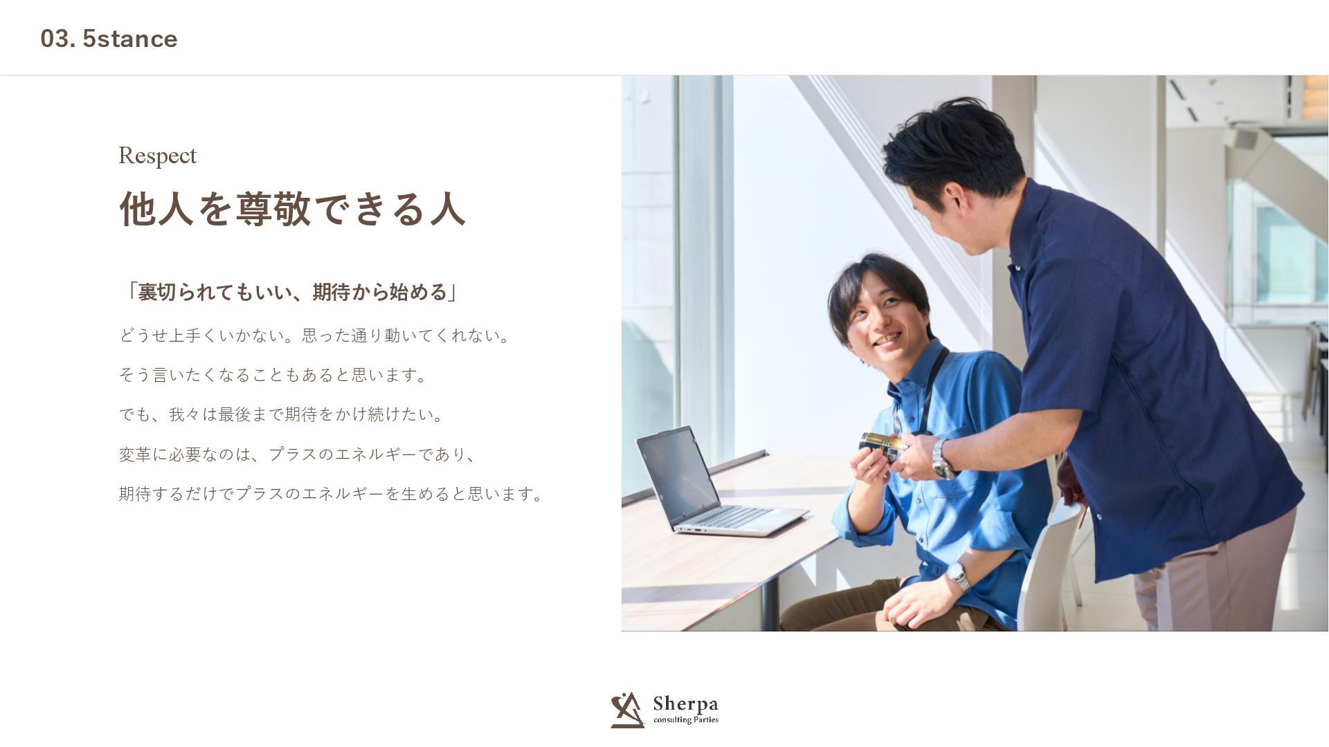 03. 5stance Respect 他人を尊敬できる人 「裏切られてもいい、期待から始める」 どうせ上手くいかない。思った通り動いてくれない。 そう言いたくなることもあると思います。 でも、我々は最後まで期待をかけ続けたい。 変革に必要なのは、プラスのエネルギーであり、 期待するだけでプラスのエネルギーを生めると思います。