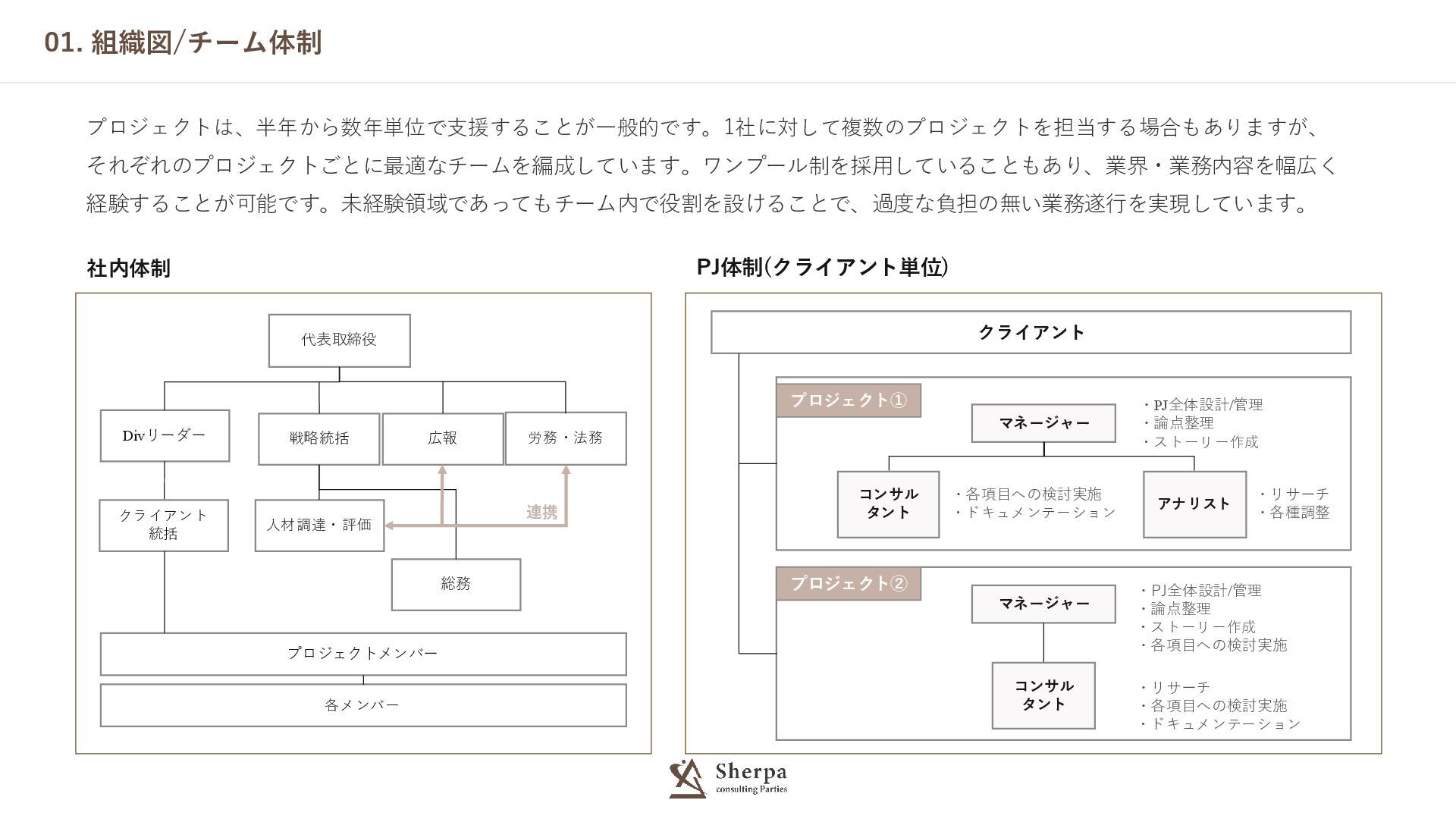 01. 組織図/チーム体制 プロジェクトは、半年から数年単位で支援することが一般的です。1社に対して複数のプロジェクトを担当する場合もありますが、 それぞれのプロジェクトごとに最適なチームを編成しています。ワンプール制を採用していることもあり、業界・業務内容を幅広く 経験することが可能です。未経験領域であってもチーム内で役割を設けることで、過度な負担の無い業務遂行を実現しています。 社内体制 PJ体制(クライアント単位) クライアント マネージャー コンサル