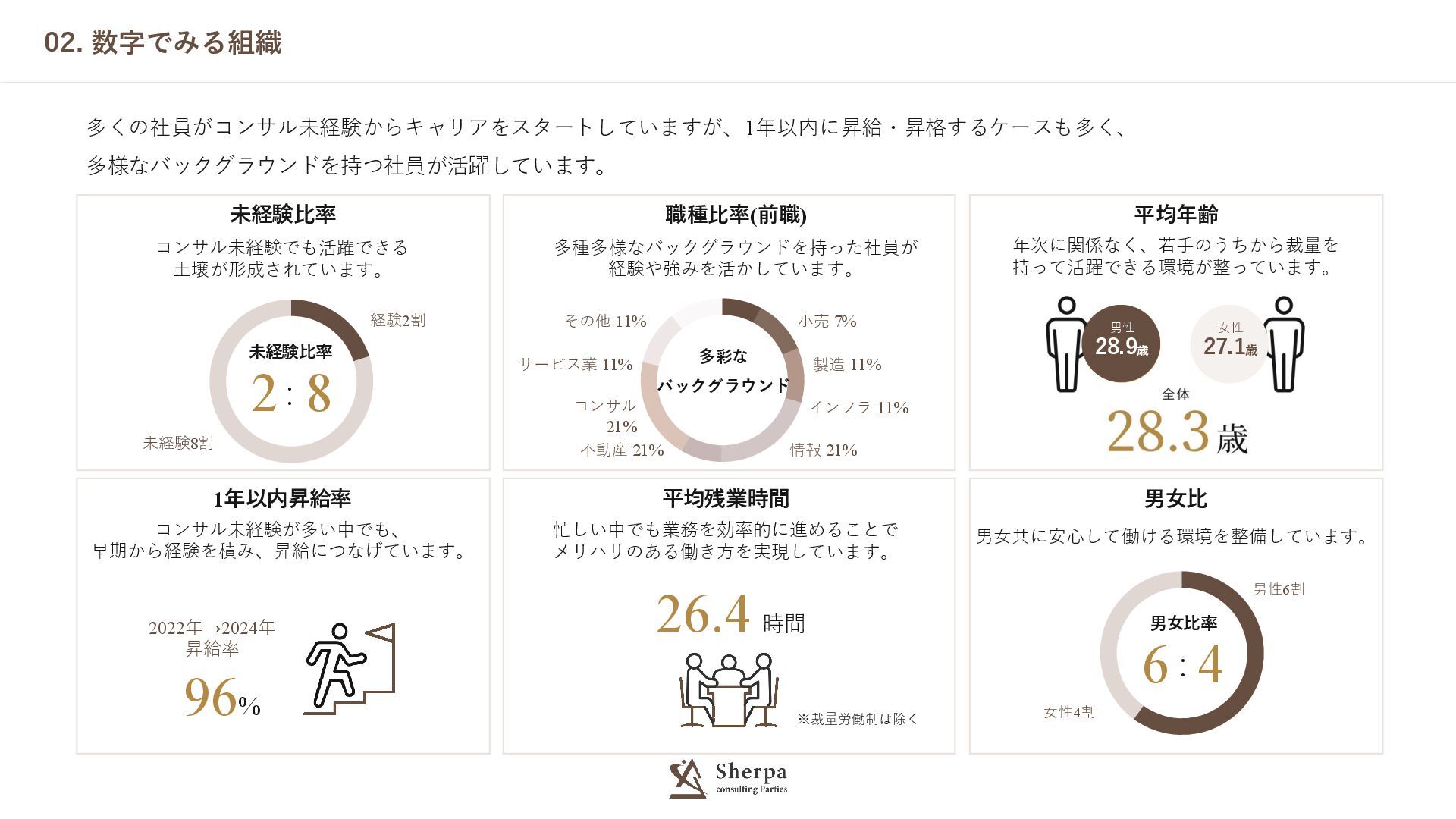 02. 数字でみる組織 平均残業時間 忙しい中でも業務を効率的に進めることで メリハリのある働き方を実現しています。 26.4 時間 ※裁量労働制は除く 職種比率(前職) 多種多様なバックグラウンドを持った社員が