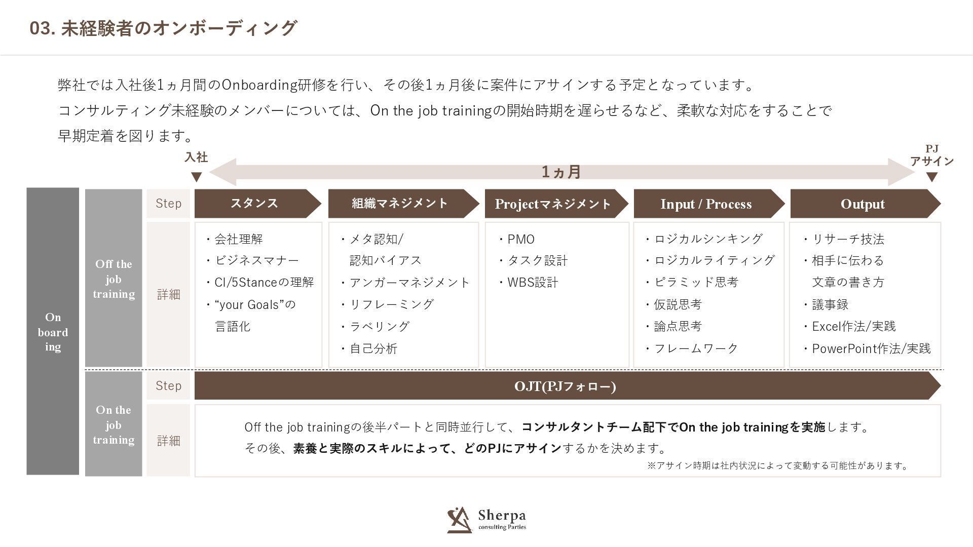 03. 未経験者のオンボーディング 弊社では入社後1ヵ月間のOnboarding研修を行い、その後1ヵ月後に案件にアサインする予定となっています。 コンサルティング未経験のメンバーについては、On the job trainingの開始時期を遅らせるなど、柔軟な対応をすることで 早期定着を図ります。 On board