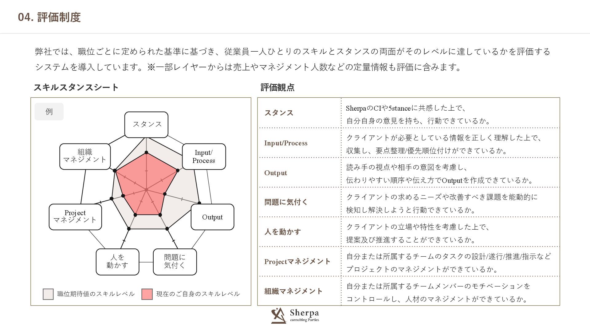 評価観点 スキルスタンスシート 04. 評価制度 弊社では、職位ごとに定められた基準に基づき、従業員一人ひとりのスキルとスタンスの両面がそのレベルに達しているかを評価する システムを導入しています。※一部レイヤーからは売上やマネジメント人数などの定量情報も評価に含みます。 スタンス 組織 マネジメント Output