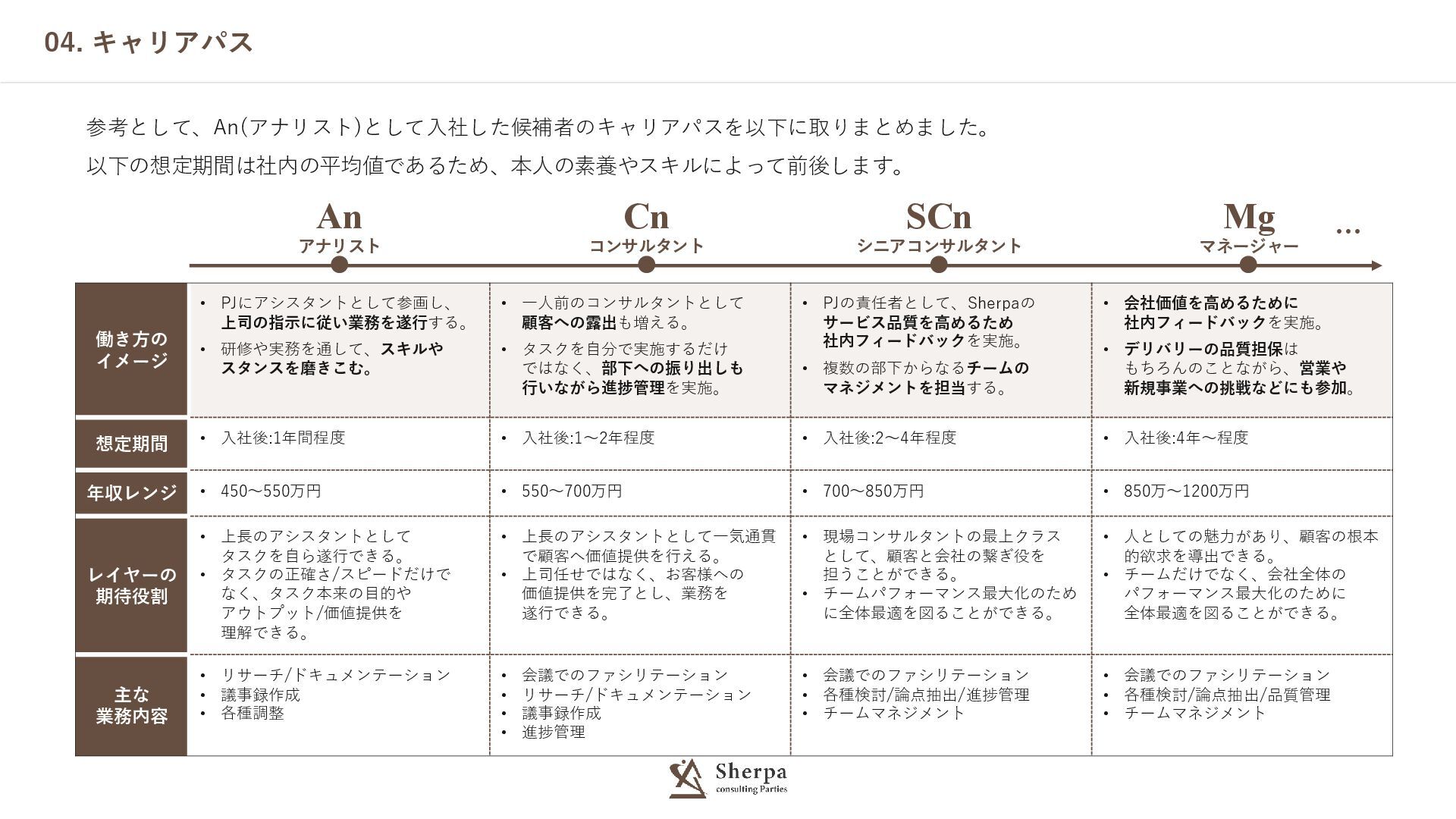 研修や実務を通して、スキルや スタンスを磨きこむ。 • 一人前のコンサルタントとして 顧客への露出も増える。 • タスクを自分で実施するだけ ではなく、部下への振り出しも 行いながら進捗管理を実施。 • PJの責任者として、Sherpaの サービス品質を高めるため 社内フィードバックを実施。 • 複数の部下からなるチームの マネジメントを担当する。 • 会社価値を高めるために 社内フィードバックを実施。 • デリバリーの品質担保は もちろんのことながら、営業や 新規事業への挑戦などにも参加。 想定期間 • 入社後:1年間程度 • 入社後:1~2年程度 • 入社後:2~4年程度 • 入社後:4年~程度 年収レンジ • 450~550万円 • 550~700万円 • 700~850万円 • 850万~1200万円 レイヤーの 期待役割 • 上長のアシスタントとして タスクを自ら遂行できる。 • タスクの正確さ/スピードだけで なく、タスク本来の目的や アウトプット/価値提供を 理解できる。 • 上長のアシスタントとして一気通貫 で顧客へ価値提供を行える。 • 上司任せではなく、お客様への 価値提供を完了とし、業務を 遂行できる。 • 現場コンサルタントの最上クラス として、顧客と会社の繋ぎ役を 担うことができる。 • チームパフォーマンス最大化のため に全体最適を図ることができる。 • 人としての魅力があり、顧客の根本 的欲求を導出できる。 • チームだけでなく、会社全体の パフォーマンス最大化のために 全体最適を図ることができる。 主な 業務内容 • リサーチ/ドキュメンテーション • 議事録作成 • 各種調整 • 会議でのファシリテーション • リサーチ/ドキュメンテーション • 議事録作成 • 進捗管理 • 会議でのファシリテーション • 各種検討/論点抽出/進捗管理 • チームマネジメント • 会議でのファシリテーション • 各種検討/論点抽出/品質管理 • チームマネジメント An アナリスト Cn コンサルタント SCn シニアコンサルタント Mg マネージャー …