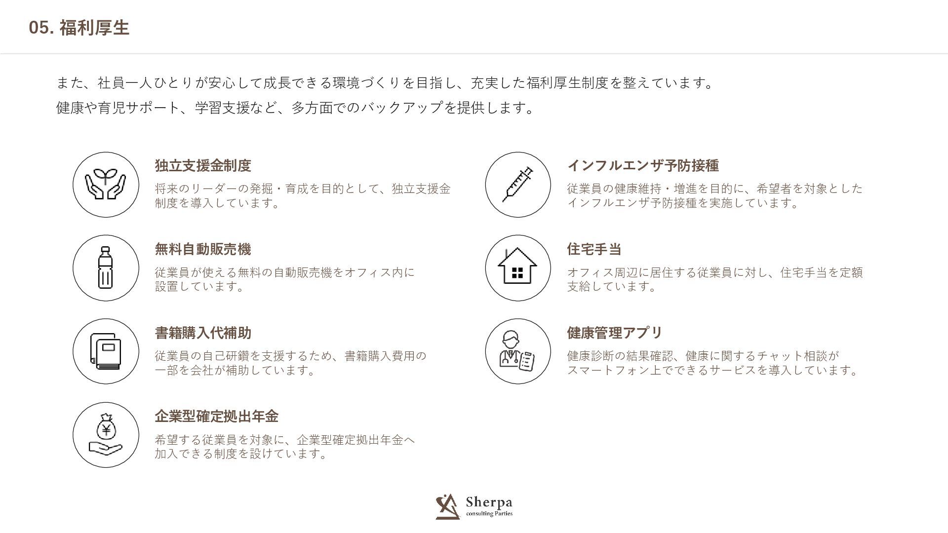 05. 福利厚生 また、社員一人ひとりが安心して成長できる環境づくりを目指し、充実した福利厚生制度を整えています。 健康や育児サポート、学習支援など、多方面でのバックアップを提供します。 健康管理アプリ 健康診断の結果確認、健康に関するチャット相談が スマートフォン上でできるサービスを導入しています。 書籍購入代補助 従業員の自己研鑽を支援するため、書籍購入費用の 一部を会社が補助しています。