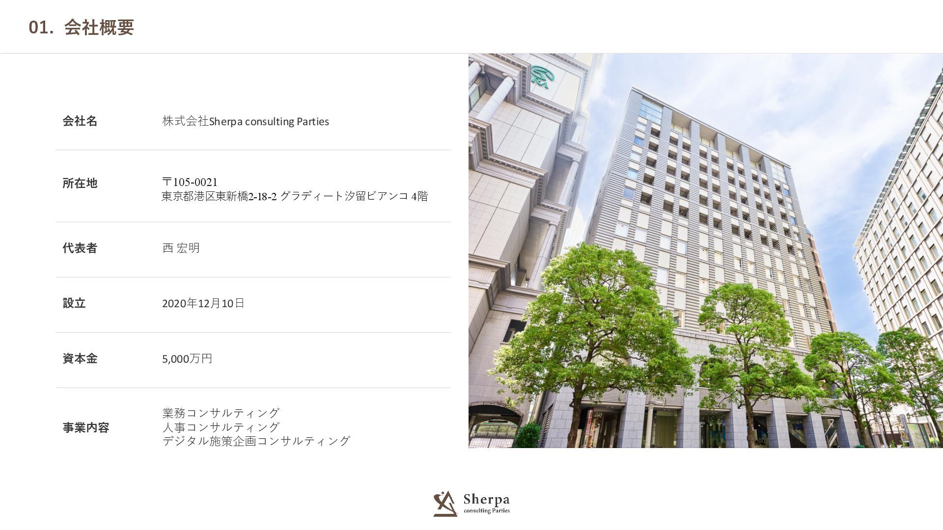 西 宏明 設立 2020年12月10日 資本金 5,000万円 事業内容 業務コンサルティング 人事コンサルティング デジタル施策企画コンサルティング 01. 会社概要