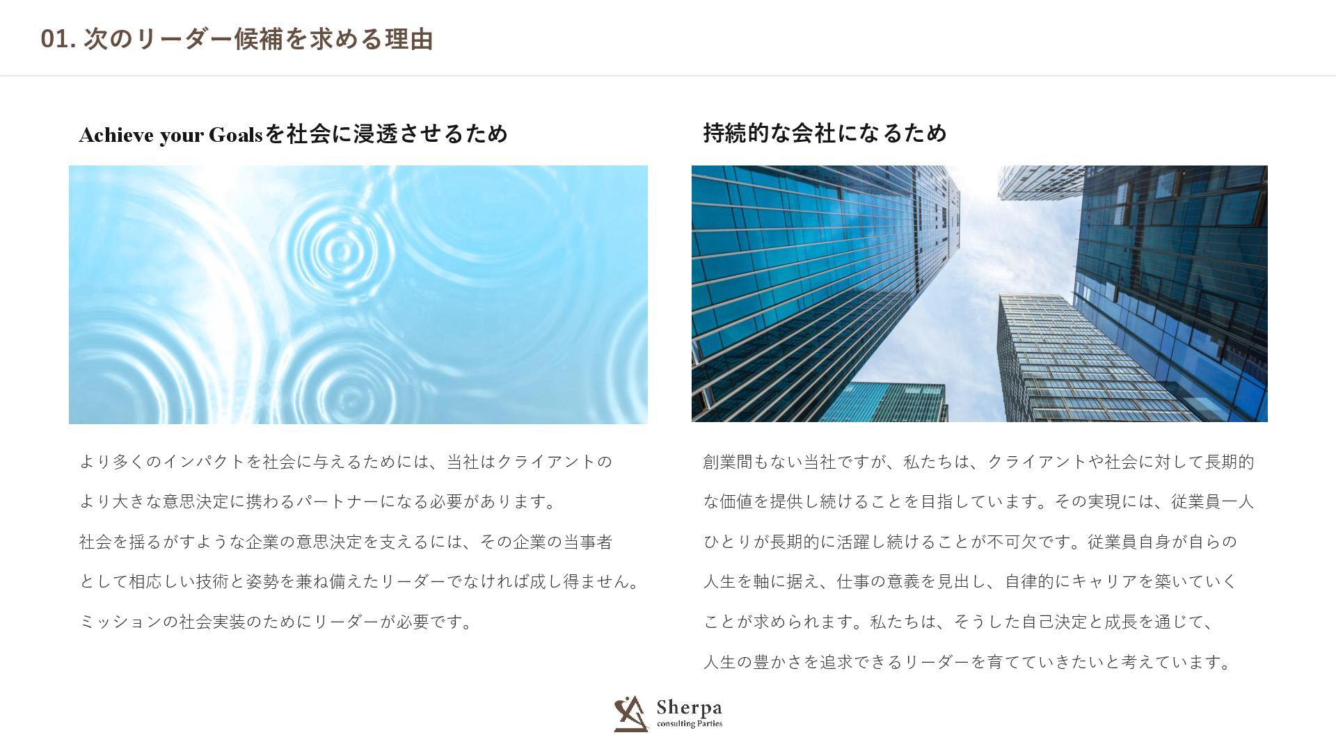 01. 次のリーダー候補を求める理由 Achieve your Goalsを社会に浸透させるため より多くのインパクトを社会に与えるためには、当社はクライアントの より大きな意思決定に携わるパートナーになる必要があります。 社会を揺るがすような企業の意思決定を支えるには、その企業の当事者 として相応しい技術と姿勢を兼ね備えたリーダーでなければ成し得ません。 ミッションの社会実装のためにリーダーが必要です。