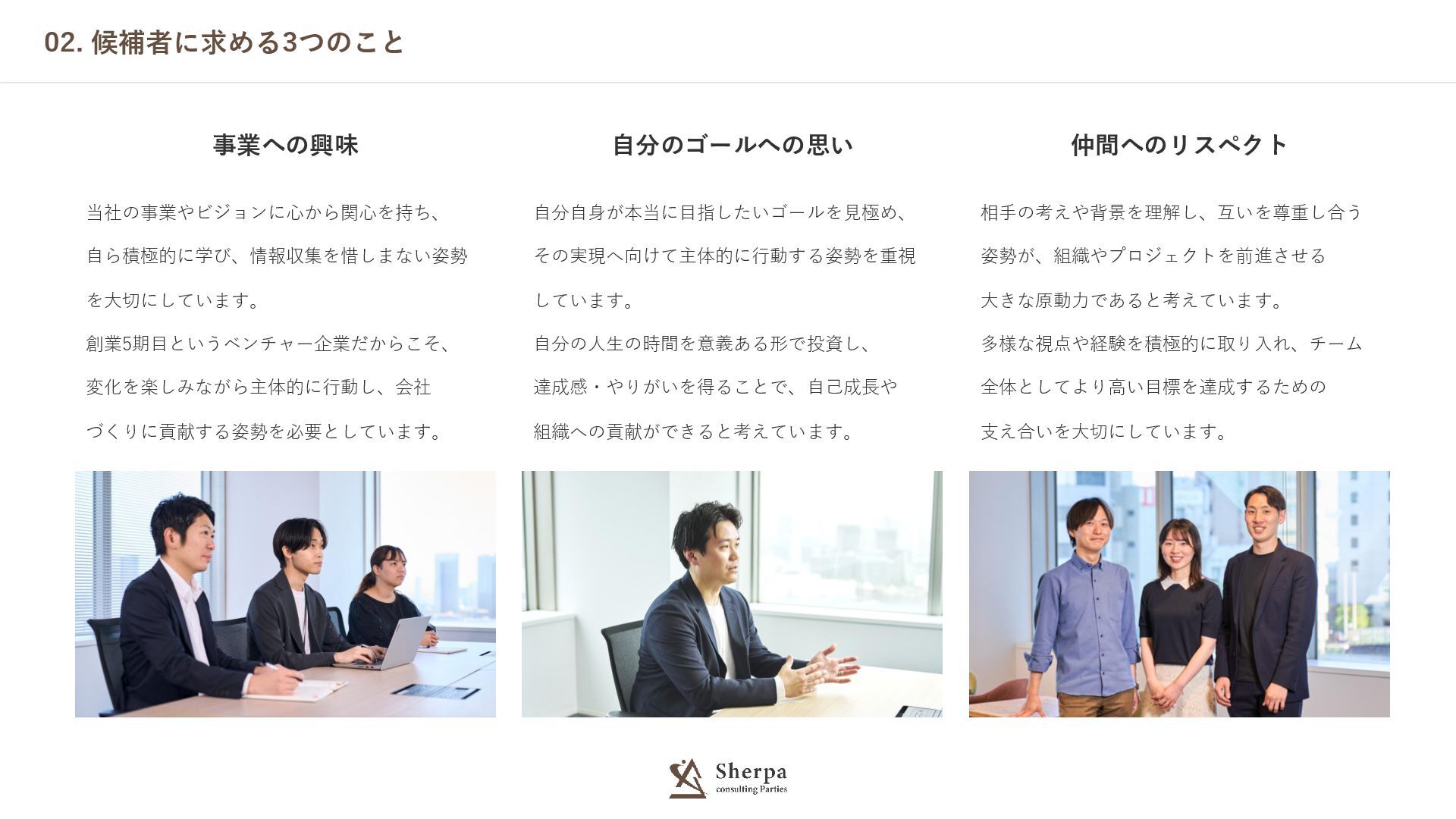 02. 候補者に求める3つのこと 事業への興味 当社の事業やビジョンに心から関心を持ち、 自ら積極的に学び、情報収集を惜しまない姿勢 を大切にしています。 創業5期目というベンチャー企業だからこそ、 変化を楽しみながら主体的に行動し、会社 づくりに貢献する姿勢を必要としています。 自分のゴールへの思い