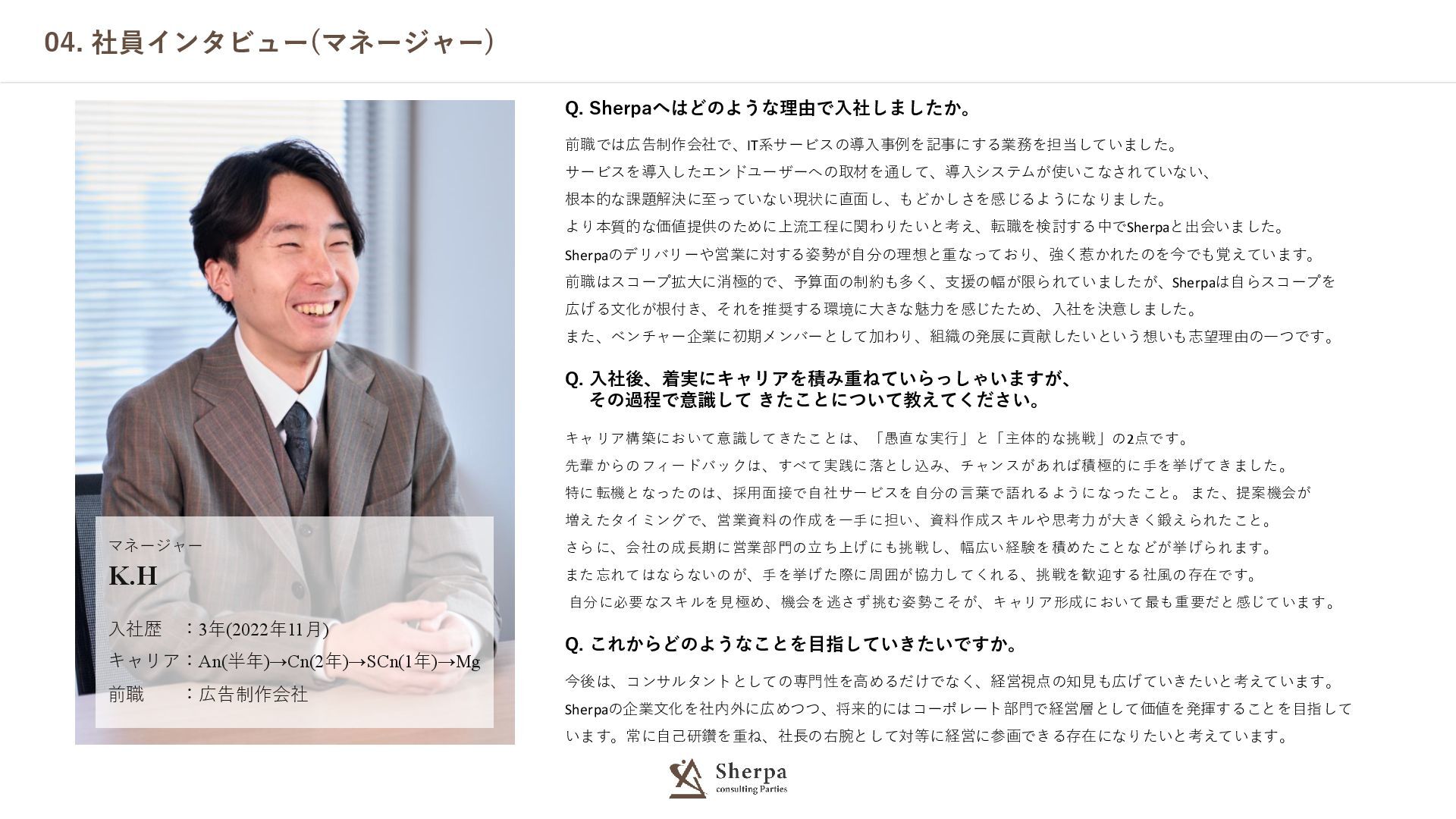 Sherpaへはどのような理由で入社しましたか。 前職では広告制作会社で、IT系サービスの導入事例を記事にする業務を担当していました。 サービスを導入したエンドユーザーへの取材を通して、導入システムが使いこなされていない、 根本的な課題解決に至っていない現状に直面し、もどかしさを感じるようになりました。 より本質的な価値提供のために上流工程に関わりたいと考え、転職を検討する中でSherpaと出会いました。 Sherpaのデリバリーや営業に対する姿勢が自分の理想と重なっており、強く惹かれたのを今でも覚えています。 前職はスコープ拡大に消極的で、予算面の制約も多く、支援の幅が限られていましたが、Sherpaは自らスコープを 広げる文化が根付き、それを推奨する環境に大きな魅力を感じたため、入社を決意しました。 また、ベンチャー企業に初期メンバーとして加わり、組織の発展に貢献したいという想いも志望理由の一つです。 Q. 入社後、着実にキャリアを積み重ねていらっしゃいますが、 その過程で意識して きたことについて教えてください。 キャリア構築において意識してきたことは、「愚直な実行」と「主体的な挑戦」の2点です。 先輩からのフィードバックは、すべて実践に落とし込み、チャンスがあれば積極的に手を挙げてきました。 特に転機となったのは、採用面接で自社サービスを自分の言葉で語れるようになったこと。 また、提案機会が 増えたタイミングで、営業資料の作成を一手に担い、資料作成スキルや思考力が大きく鍛えられたこと。 さらに、会社の成長期に営業部門の立ち上げにも挑戦し、幅広い経験を積めたことなどが挙げられます。 また忘れてはならないのが、手を挙げた際に周囲が協力してくれる、挑戦を歓迎する社風の存在です。 自分に必要なスキルを見極め、機会を逃さず挑む姿勢こそが、キャリア形成において最も重要だと感じています。 Q. これからどのようなことを目指していきたいですか。 今後は、コンサルタントとしての専門性を高めるだけでなく、経営視点の知見も広げていきたいと考えています。 Sherpaの企業文化を社内外に広めつつ、将来的にはコーポレート部門で経営層として価値を発揮することを目指して います。常に自己研鑽を重ね、社長の右腕として対等に経営に参画できる存在になりたいと考えています。