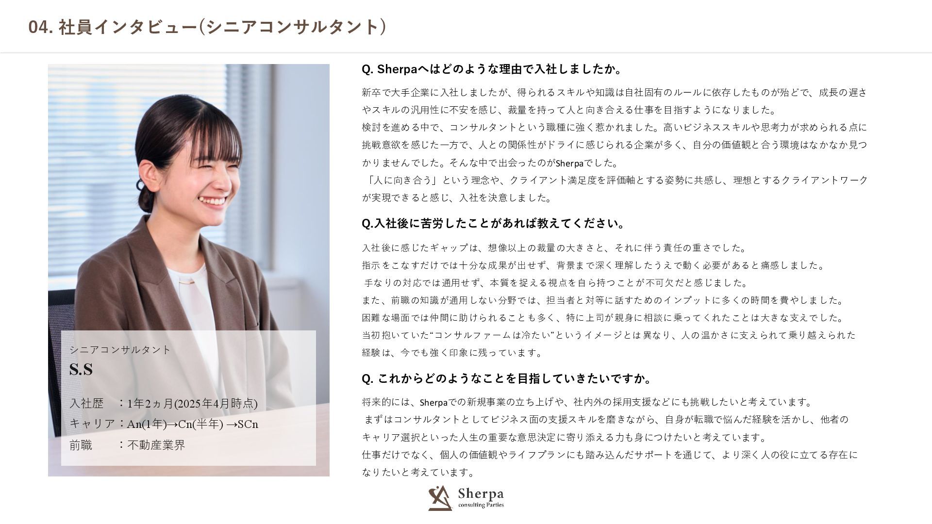04. 社員インタビュー(シニアコンサルタント) S.S 入社歴 :1年2ヵ月(2025年4月時点) キャリア:An(1年)→Cn(半年) →SCn 前職 :不動産業界 シニアコンサルタント