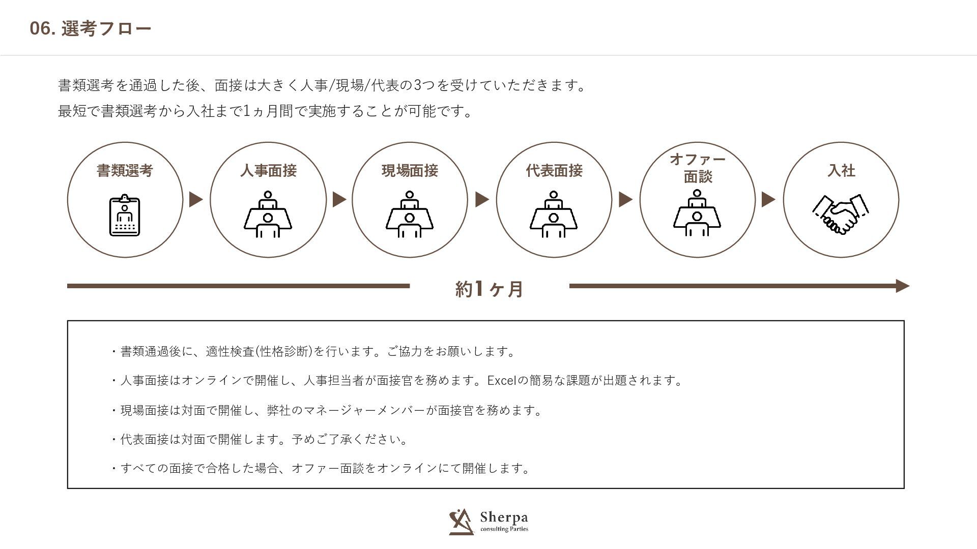 06. 選考フロー 書類選考 人事面接 代表面接 ・書類通過後に、適性検査(性格診断)を行います。ご協力をお願いします。 ・人事面接はオンラインで開催し、人事担当者が面接官を務めます。Excelの簡易な課題が出題されます。 ・現場面接は対面で開催し、弊社のマネージャーメンバーが面接官を務めます。 ・代表面接は対面で開催します。予めご了承ください。 ・すべての面接で合格した場合、オファー面談をオンラインにて開催します。
