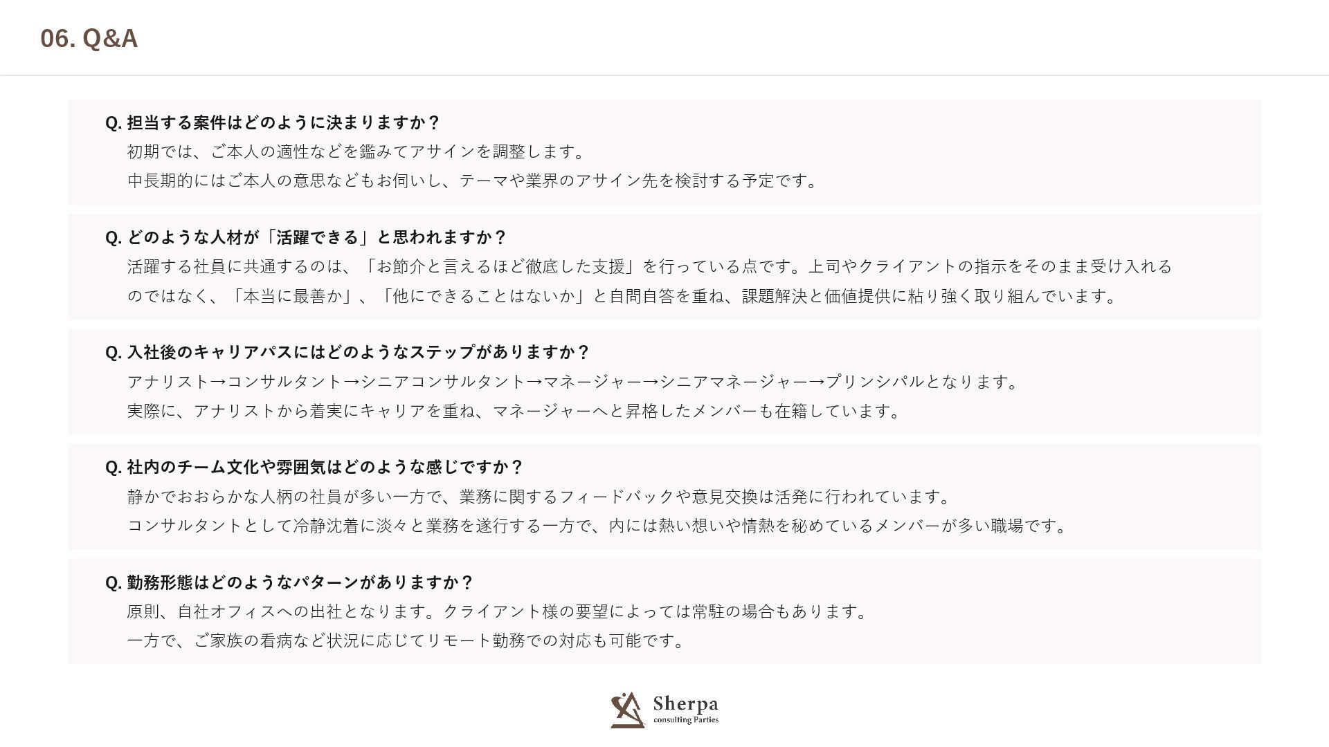 06. Q&A 初期では、ご本人の適性などを鑑みてアサインを調整します。 中長期的にはご本人の意思などもお伺いし、テーマや業界のアサイン先を検討する予定です。 Q. 担当する案件はどのように決まりますか? 活躍する社員に共通するのは、「お節介と言えるほど徹底した支援」を行っている点です。上司やクライアントの指示をそのまま受け入れる のではなく、「本当に最善か」、「他にできることはないか」と自問自答を重ね、課題解決と価値提供に粘り強く取り組んでいます。 Q. どのような人材が「活躍できる」と思われますか?