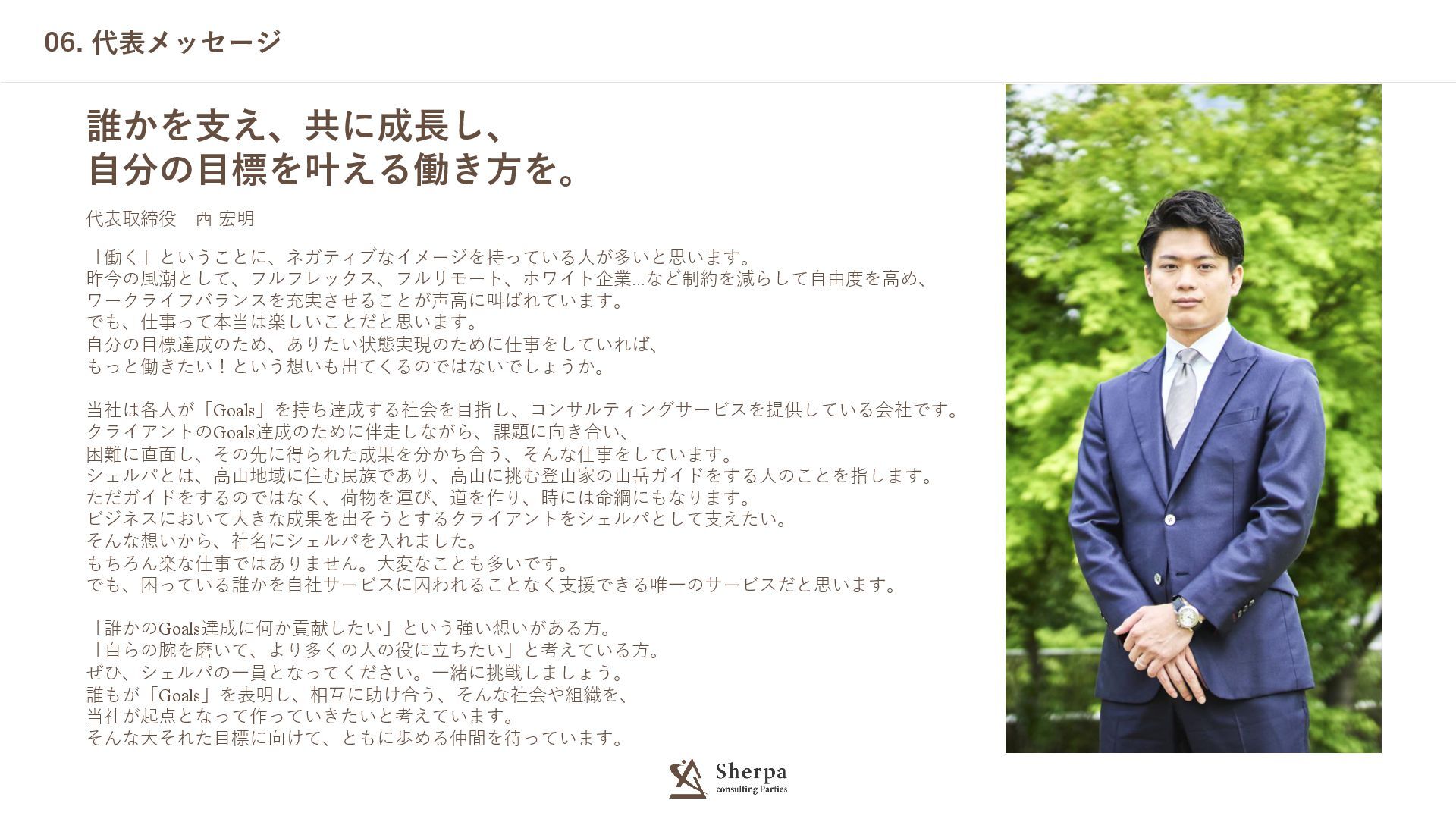 06. 代表メッセージ 代表取締役 西 宏明 誰かを支え、共に成長し、 自分の目標を叶える働き方を。 「働く」ということに、ネガティブなイメージを持っている人が多いと思います。 昨今の風潮として、フルフレックス、フルリモート、ホワイト企業...など制約を減らして自由度を高め、 ワークライフバランスを充実させることが声高に叫ばれています。