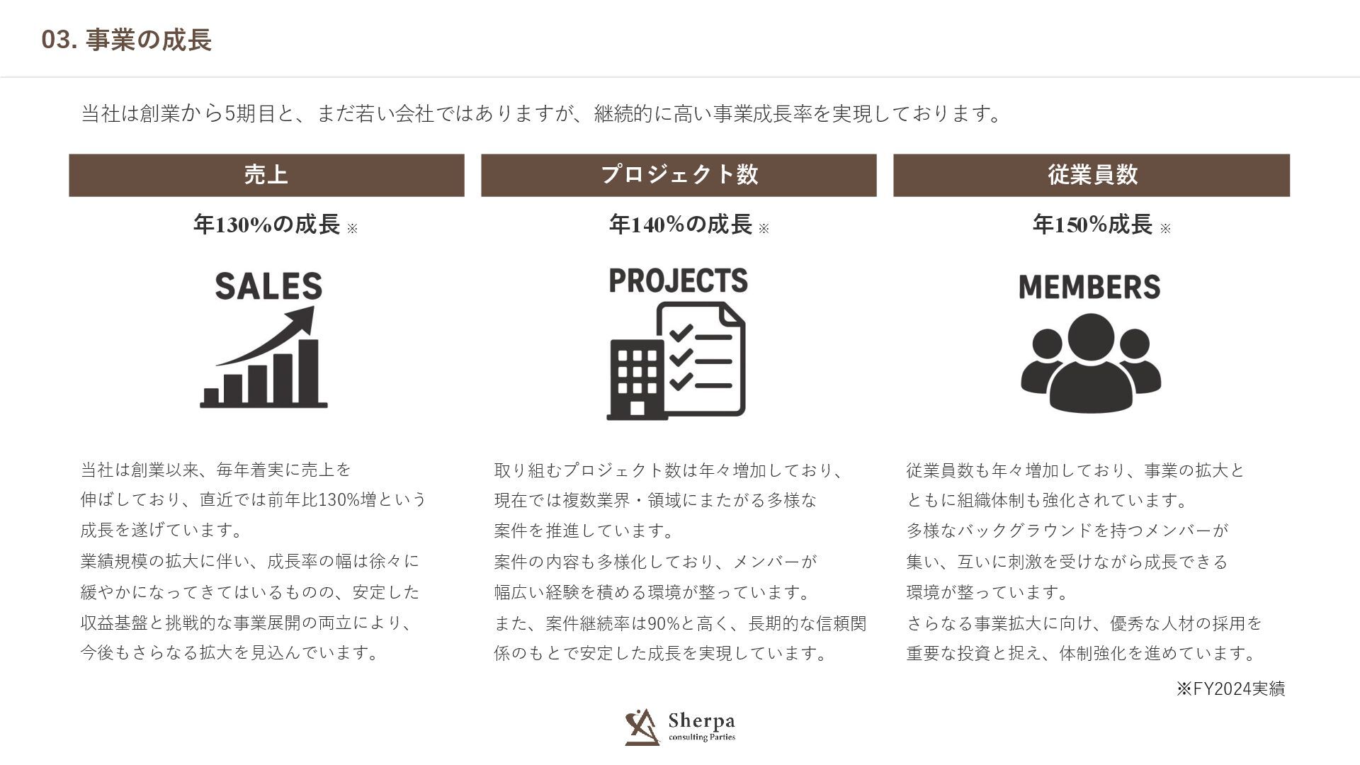03. 事業の成長 売上 プロジェクト数 従業員数 ※FY2024実績 年130%の成長 当社は創業以来、毎年着実に売上を 伸ばしており、直近では前年比130%増という 成長を遂げています。