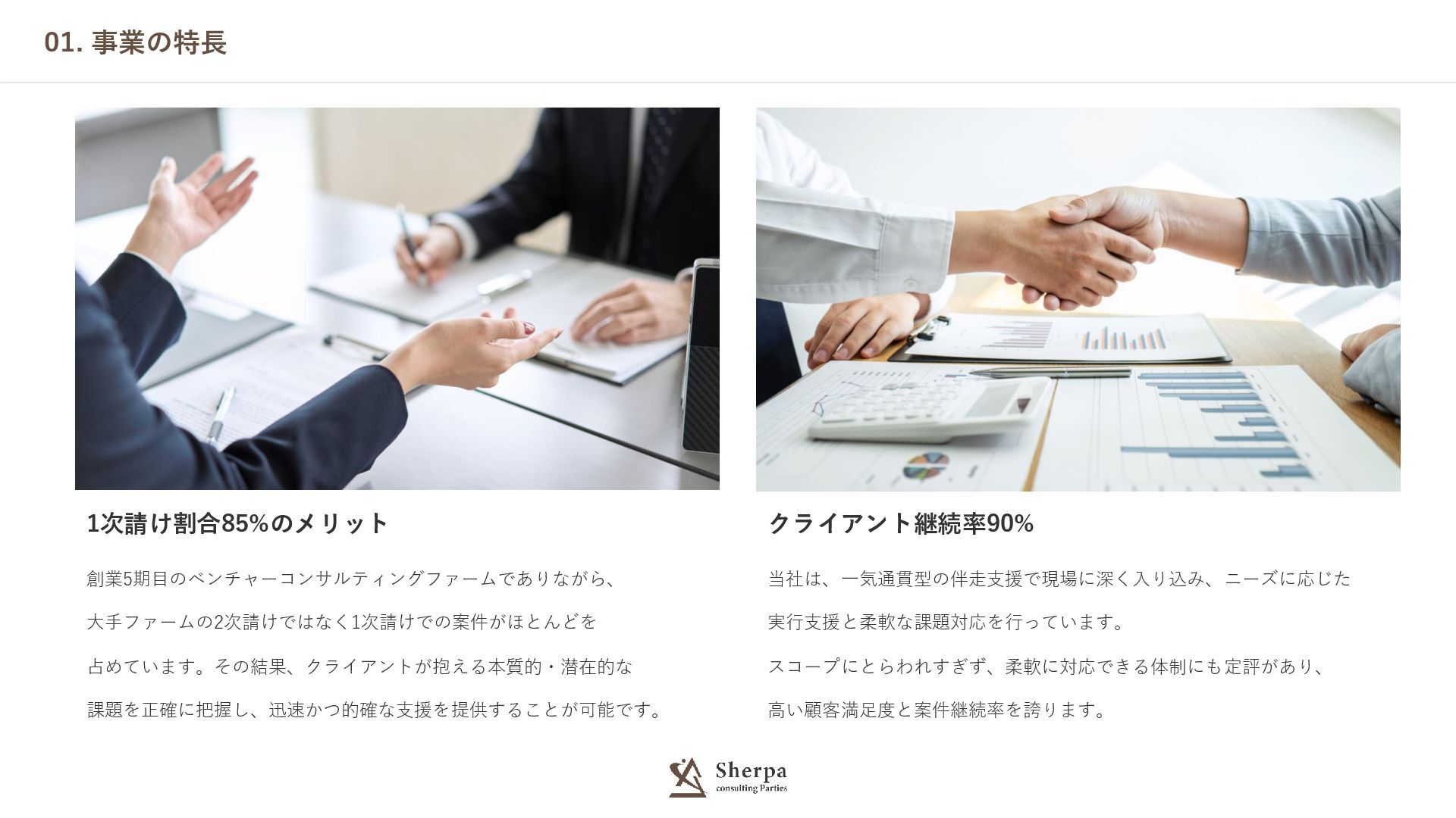 01. 事業の特長 創業5期目のベンチャーコンサルティングファームでありながら、 大手ファームの2次請けではなく1次請けでの案件がほとんどを 占めています。その結果、クライアントが抱える本質的・潜在的な 課題を正確に把握し、迅速かつ的確な支援を提供することが可能です。 1次請け割合85%のメリット 当社は、一気通貫型の伴走支援で現場に深く入り込み、ニーズに応じた 実行支援と柔軟な課題対応を行っています。 スコープにとらわれすぎず、柔軟に対応できる体制にも定評があり、