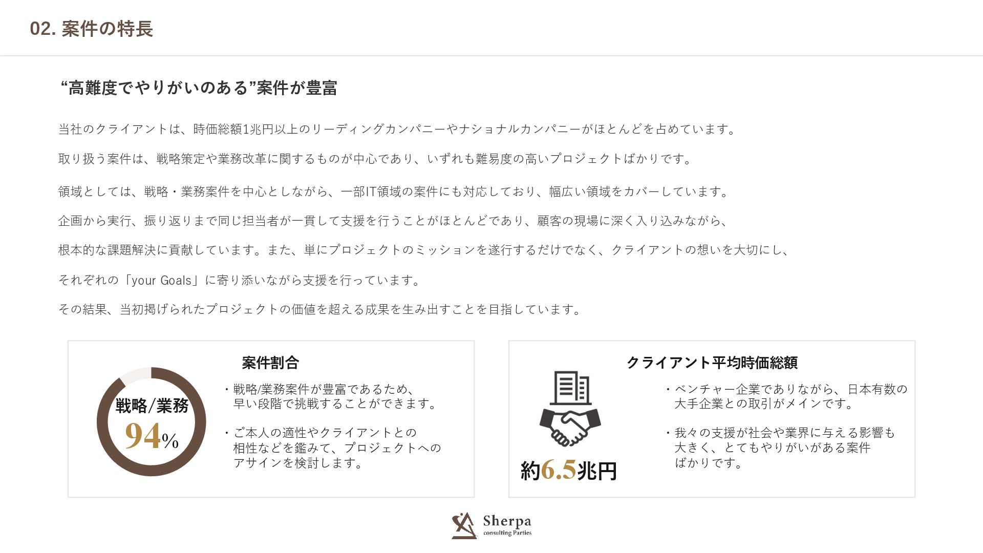 02. 案件の特長 “高難度でやりがいのある”案件が豊富 当社のクライアントは、時価総額1兆円以上のリーディングカンパニーやナショナルカンパニーがほとんどを占めています。 取り扱う案件は、戦略策定や業務改革に関するものが中心であり、いずれも難易度の高いプロジェクトばかりです。 領域としては、戦略・業務案件を中心としながら、一部IT領域の案件にも対応しており、幅広い領域をカバーしています。 企画から実行、振り返りまで同じ担当者が一貫して支援を行うことがほとんどであり、顧客の現場に深く入り込みながら、 根本的な課題解決に貢献しています。また、単にプロジェクトのミッションを遂行するだけでなく、クライアントの想いを大切にし、 それぞれの「your Goals」に寄り添いながら支援を行っています。