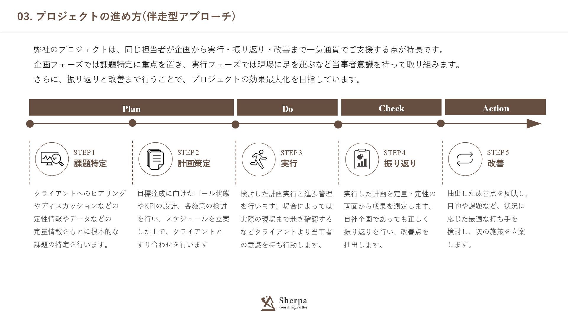 03. プロジェクトの進め方(伴走型アプローチ) 弊社のプロジェクトは、同じ担当者が企画から実行・振り返り・改善まで一気通貫でご支援する点が特長です。 企画フェーズでは課題特定に重点を置き、実行フェーズでは現場に足を運ぶなど当事者意識を持って取り組みます。 さらに、振り返りと改善まで行うことで、プロジェクトの効果最大化を目指しています。 クライアントへのヒアリング やディスカッションなどの 定性情報やデータなどの 定量情報をもとに根本的な 課題の特定を行います。