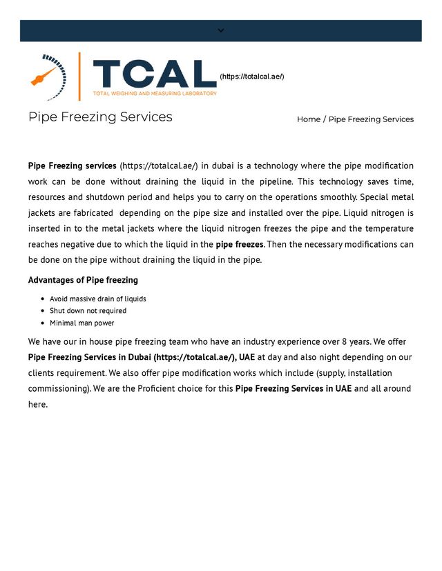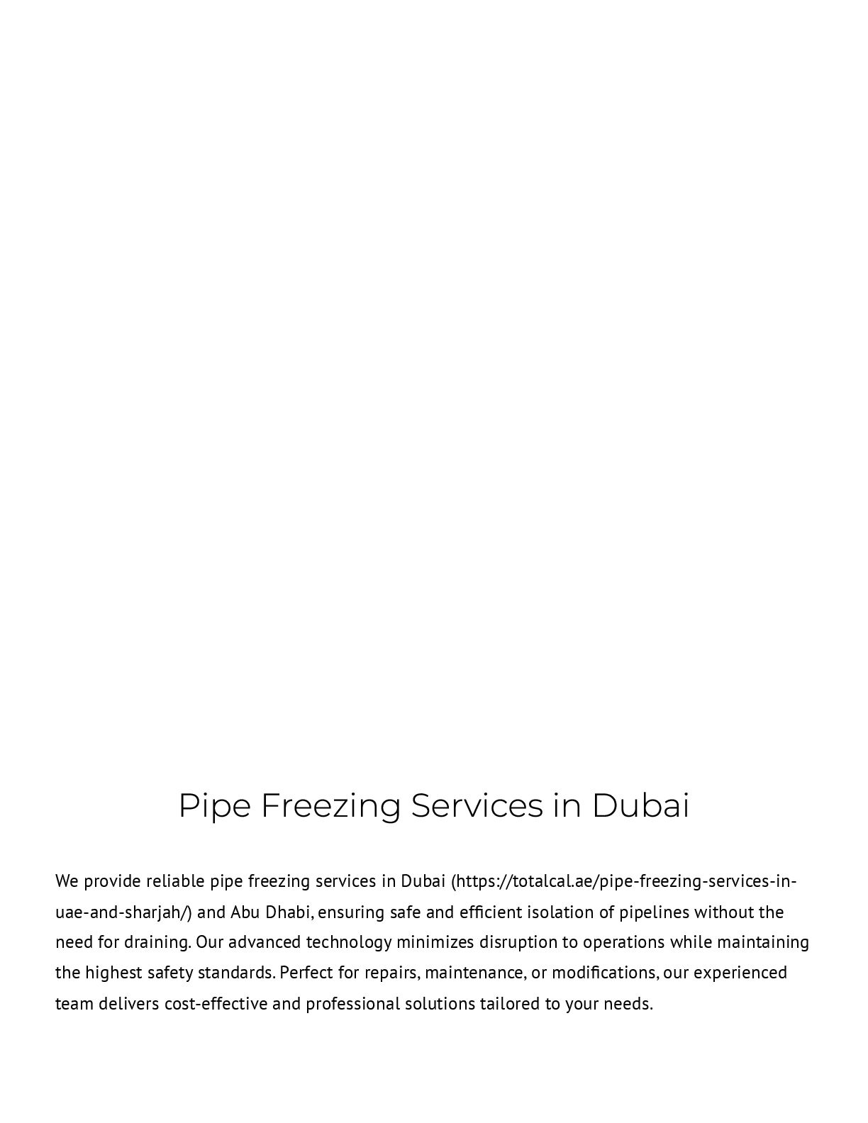 Ensure safe and efficient piping maintenance with professional Pipe Freezing Companies in Ajman. Our certified technicians provide reliable freezing solutions for industrial, commercial, and residential pipelines, allowing repairs or modifications without shutting down entire systems. Using advanced equipment and proven techniques, we deliver precise, cost-effective, and timely services that minimize downtime and prevent operational disruptions. Trust Ajman’s leading pipe freezing specialists for professional, safe, and efficient solutions tailored to your requirements. For more info visit: https://totalcal.ae/pipe-freezing-services-dubai/