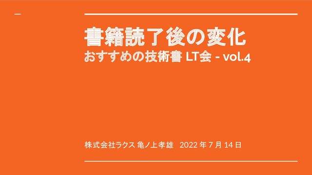 書籍読了後の変化 おすすめの技術書 LT会 - vol.4 株式会社ラクス 亀ノ上孝雄 2022 年 7