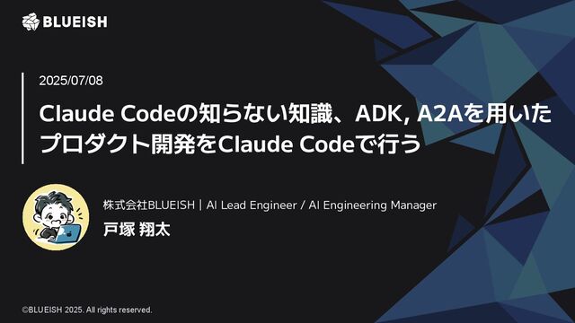 Claude Codeの知らない知識、ADK, A2Aを用いた プロダクト開発をClaude Codeで行う 戸塚 翔太 2025/07/08 株式会社BLUEISH|AI Lead