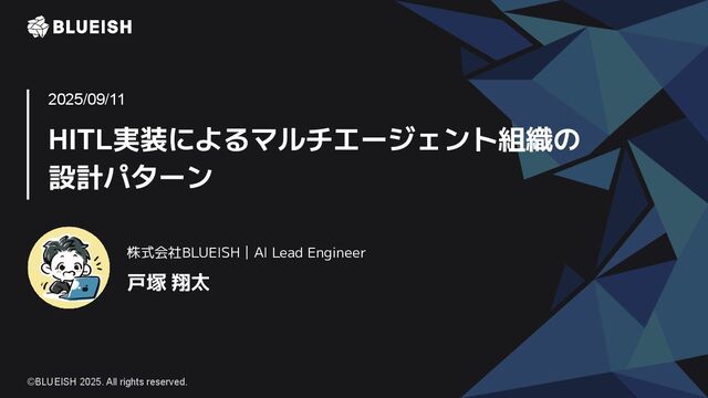 HITL実装によるマルチエージェント組織の 設計パターン 戸塚 翔太 2025/09/11 株式会社BLUEISH|AI Lead Engineer ©BLUEISH 2025.