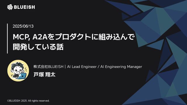 起業家ピッチ」準優勝 ◦ シードラウンドで3億円の資金調達を実施 • 経験豊富なメンバーで開発 ◦ 役員の5/8がCTO・CIO経験者 ◦ Google、マイクロソフト出身のメンバーを迎え、更に体制強化中 • 最先端のAI技術を積極的に活用 AI エンジニア、フルスタックエンジニア、BE・FE、PM などのポジションで積極的に採用中! 【Wantedly】 採用について MCP, A2Aをプロダクトに組み込んで開発している話 ©BLUEISH 2025. All rights reserved.