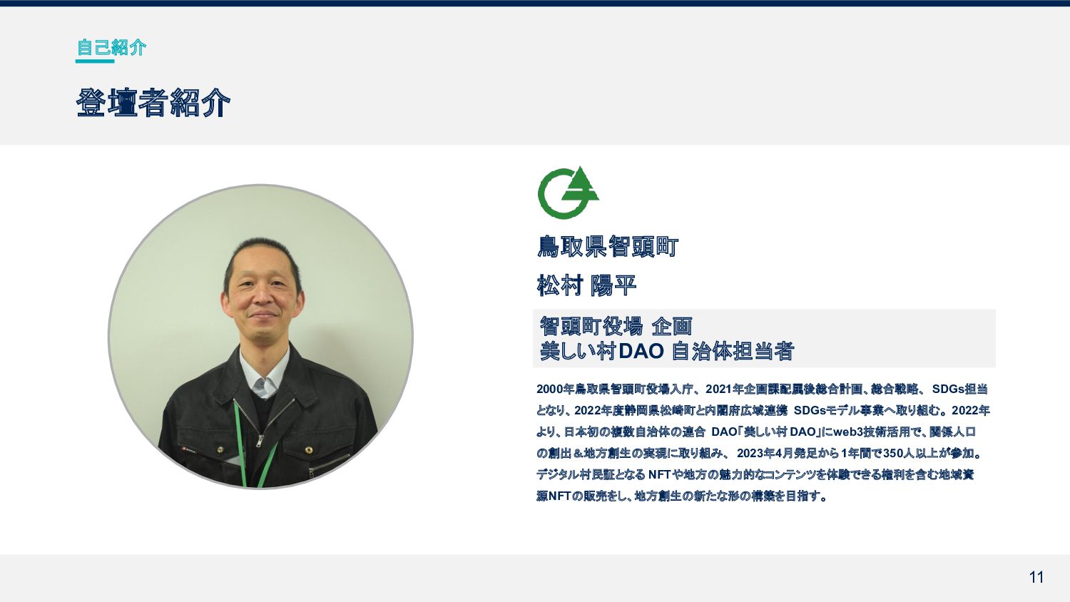 より、日本初の複数自治体の連合 DAO「美しい村DAO」にweb3技術活用で、関係人口 の創出&地方創生の実現に取り組み、 2023年4月発足から 1年間で350人以上が参加。 デジタル村民証となる NFTや地方の魅力的なコンテンツを体験できる権利を含む地域資 源NFTの販売をし、地方創生の新たな形の構築を目指す。 智頭町役場 企画 美しい村DAO 自治体担当者 鳥取県智頭町 自己紹介