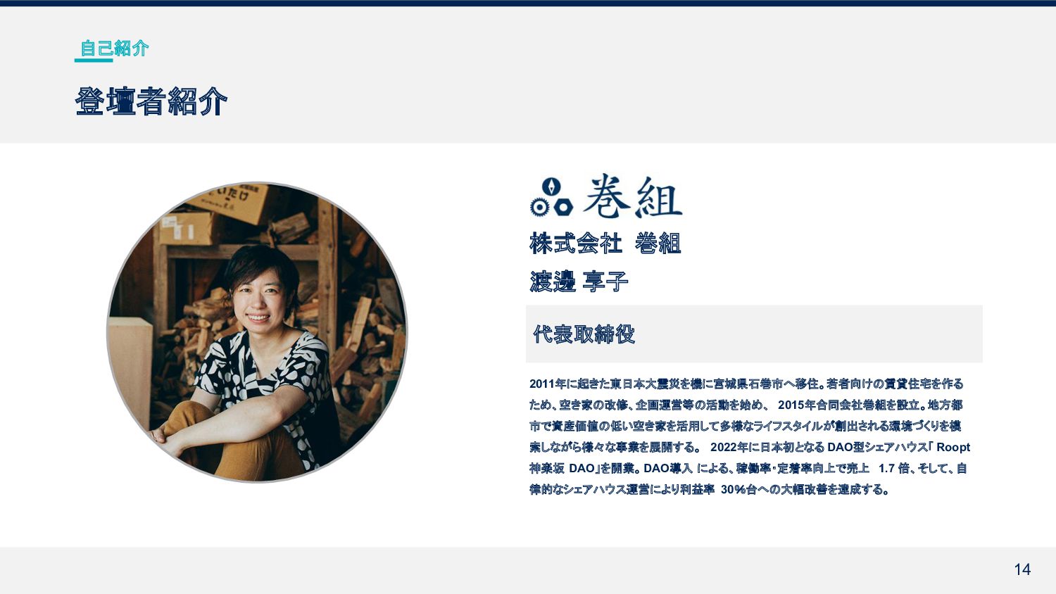 DAO型シェアハウス「 Roopt 神楽坂 DAO」を開業。DAO導入 による、稼働率・定着率向上で売上 1.7 倍、そして、自 律的なシェアハウス運営により利益率 30%台への大幅改善を達成する。 代表取締役 株式会社 巻組 自己紹介