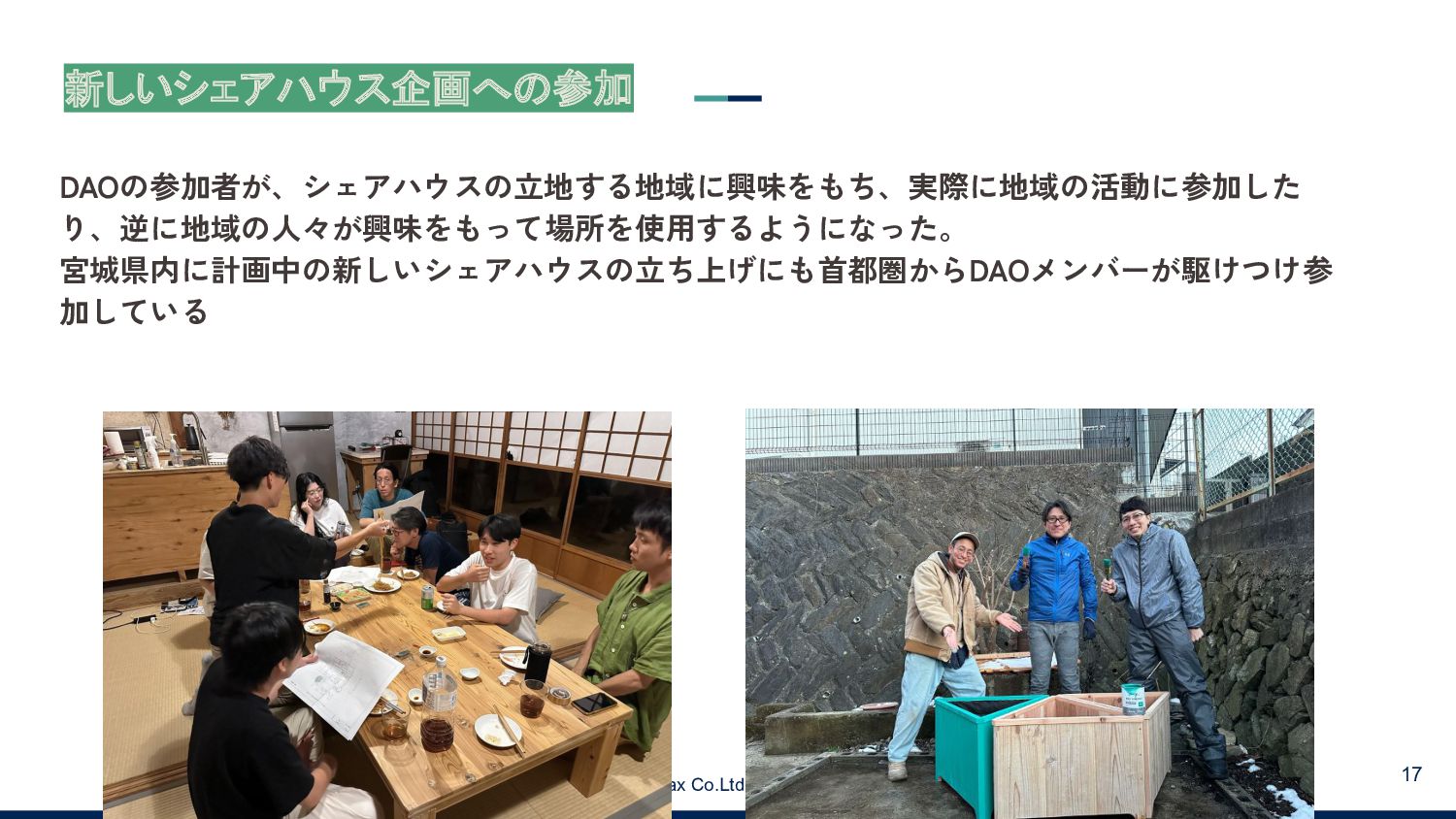 り、逆に地域の人々が興味をもって場所を使用するようになった。 宮城県内に計画中の新しいシェアハウスの立ち上げにも首都圏からDAOメンバーが駆けつけ参 加している