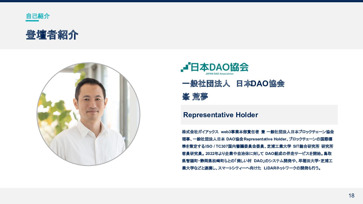 Holder、ブロックチェーンの国際標 準を策定する ISO / TC307国内審議委員会委員、芝浦工業大学 SIT総合研究所 研究所 客員研究員。 2022年より企業や自治体に対して DAO組成の伴走サービスを開始。鳥取 県智頭町・静岡県松崎町らとの「美しい村 DAO」のシステム開発や、早稲田大学・芝浦工 業大学などと連携し、スマートシティーへ向けた LiDARネットワークの開発も行う。 Representative Holder 一般社団法人 日本DAO協会 自己紹介