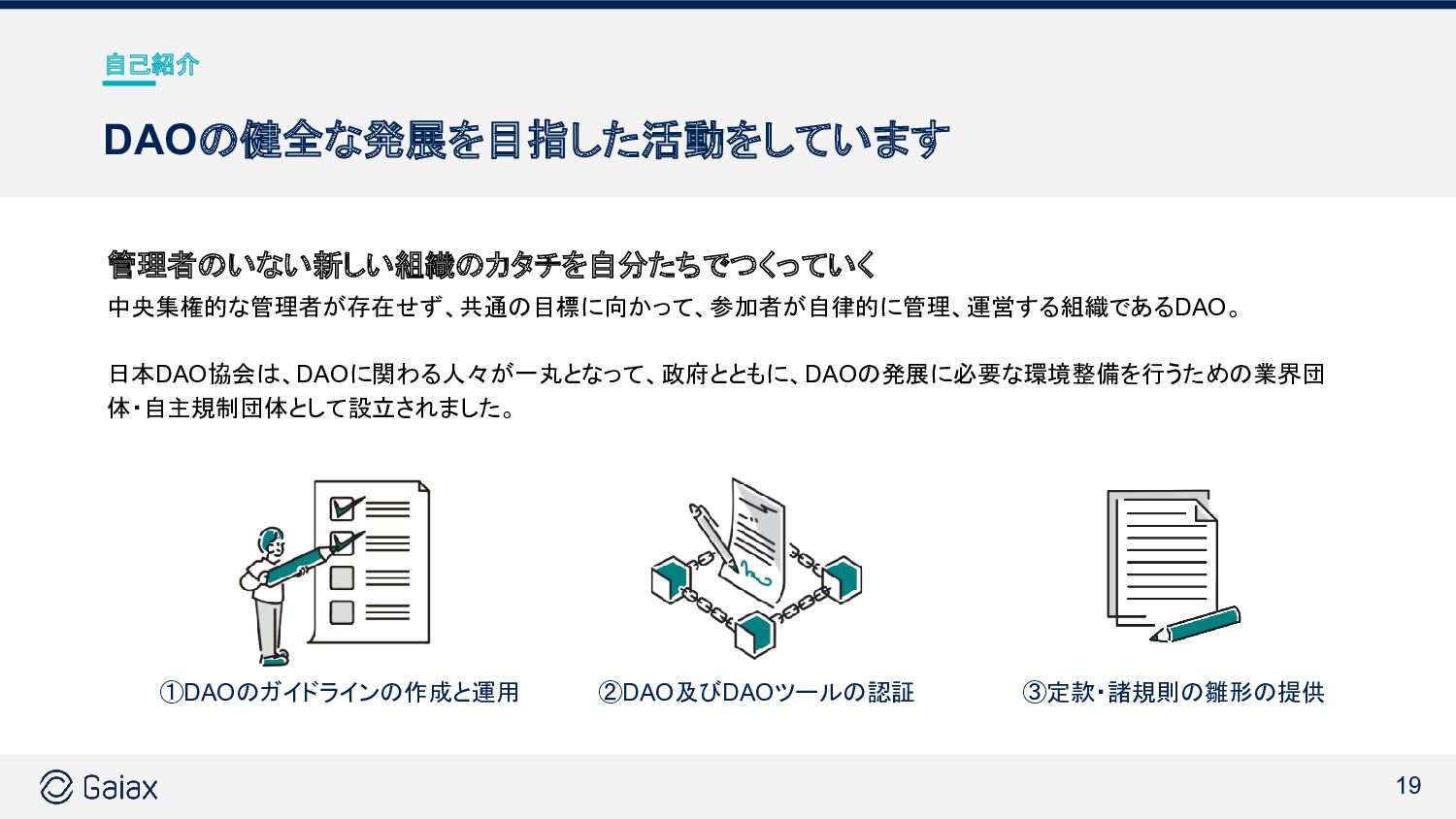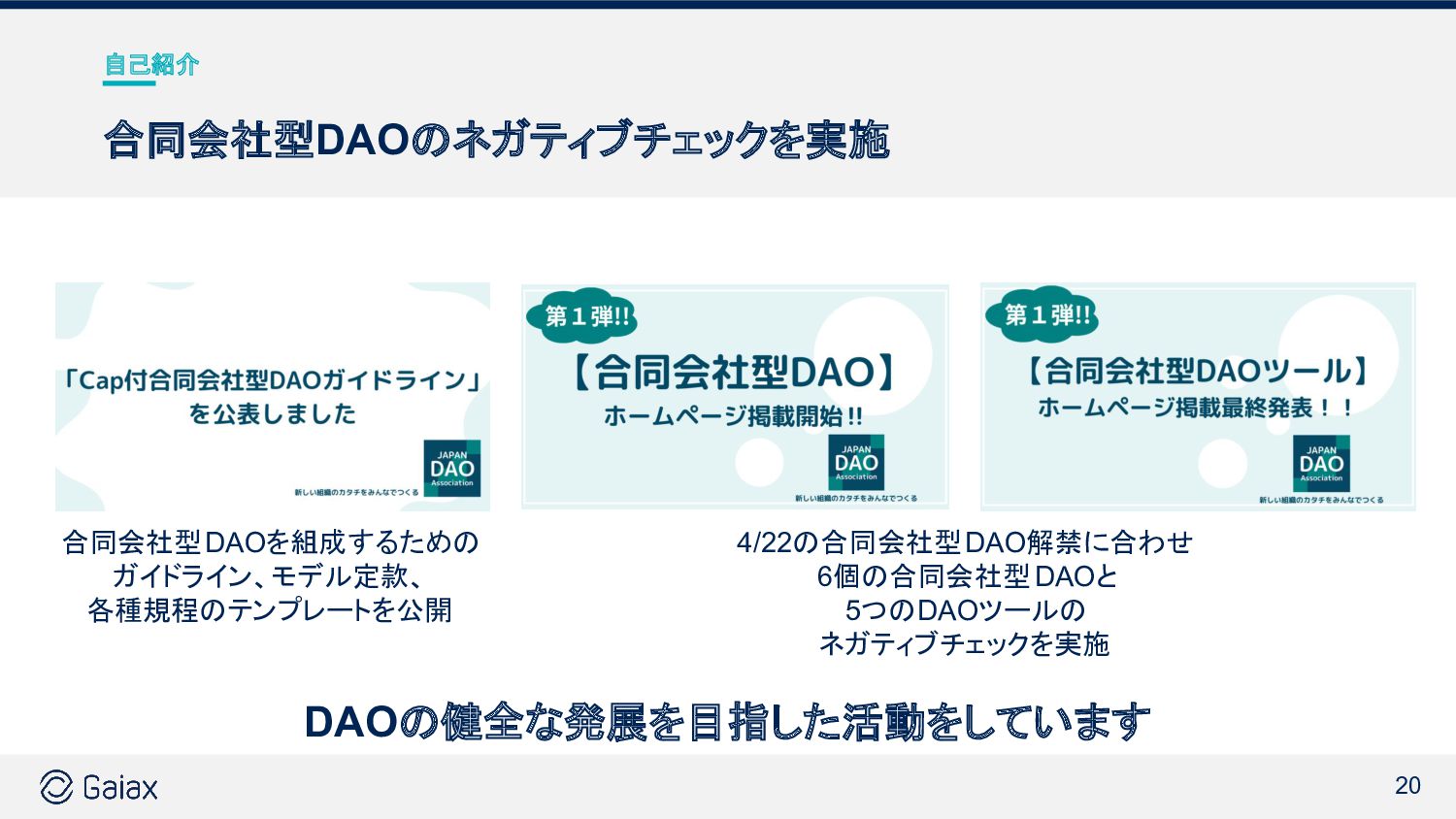 19 自己紹介 DAOの健全な発展を目指した活動をしています ①DAOのガイドラインの作成と運用 ②DAO及びDAOツールの認証 ③定款・諸規則の雛形の提供 管理者のいない新しい組織のカタチを自分たちでつくっていく 中央集権的な管理者が存在せず、共通の目標に向かって、参加者が自律的に管理、運営する組織であるDAO。 日本DAO協会は、DAOに関わる人々が一丸となって、政府とともに、DAOの発展に必要な環境整備を行うための業界団 体・自主規制団体として設立されました。