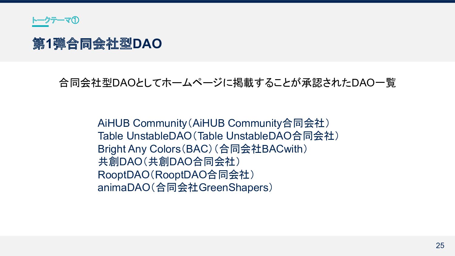 25 第1弾合同会社型DAO トークテーマ① AiHUB Community(AiHUB Community合同会社) Table UnstableDAO(Table UnstableDAO合同会社) Bright