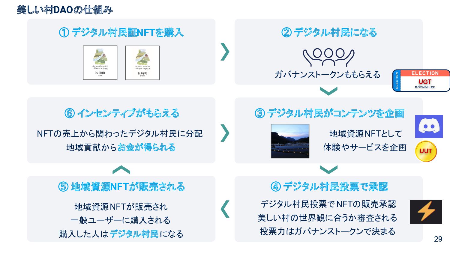 すべての約束事・ルールの基に関する キーワード ① デジタル村民証NFTを購入 ② デジタル村民になる ③ デジタル村民がコンテンツを企画 地域資源NFTとして 体験やサービスを企画 ⑥ インセンティブがもらえる NFTの売上から関わったデジタル村民に分配 地域貢献からお金が得られる デジタル村民投票で NFTの販売承認 美しい村の世界観に合うか審査される 投票力はガバナンストークンで決まる ガバナンストークンももらえる UUT UGT ガバナンストークン 29