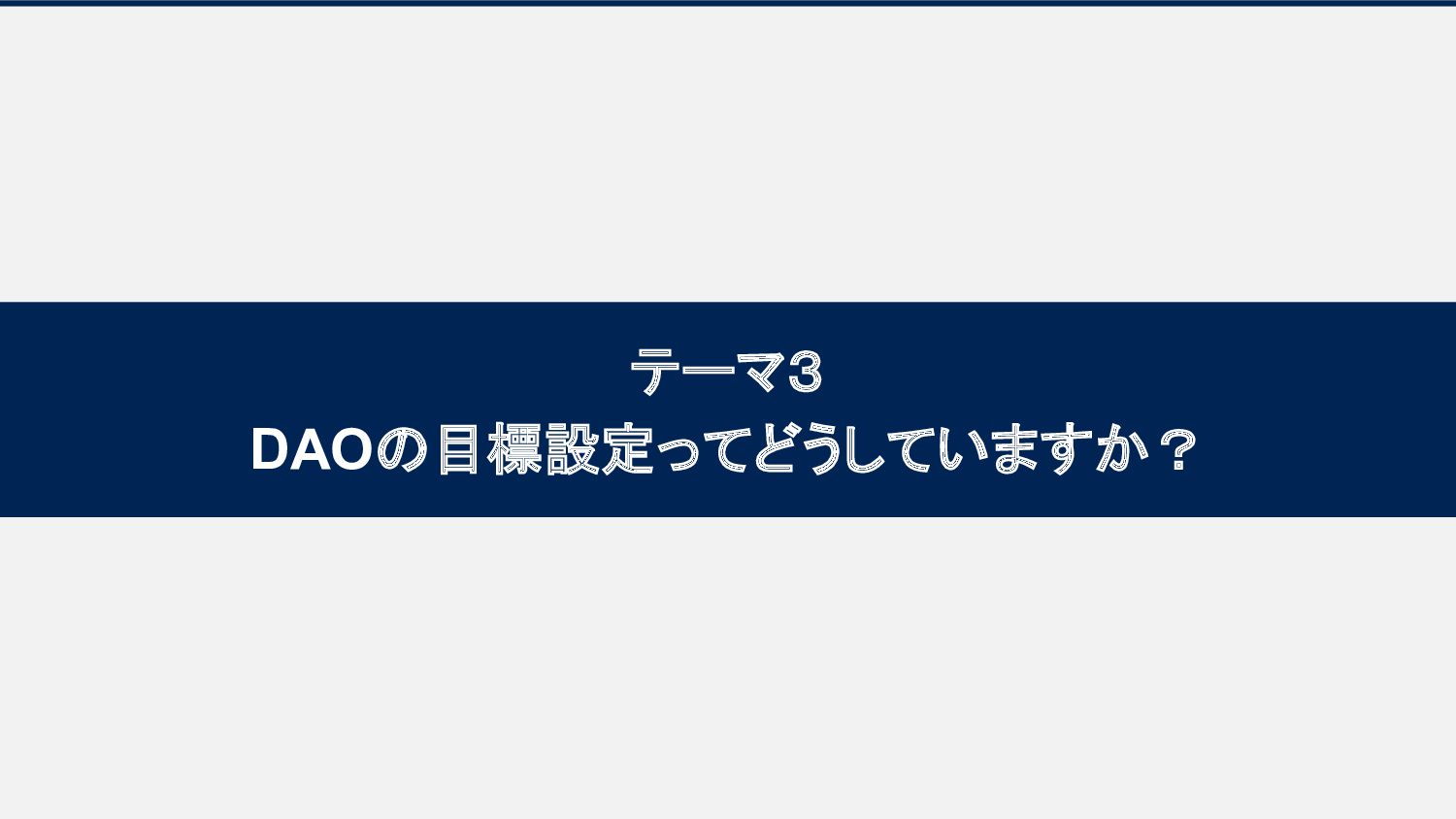 22 トークテーマ テーマ一覧 1. 合同会社型DAOの利用、すすんでいますか? 2. 企業/自治体での予算をどう取ればいいの? 3. DAOの目標設定ってどうしていますか? 4.