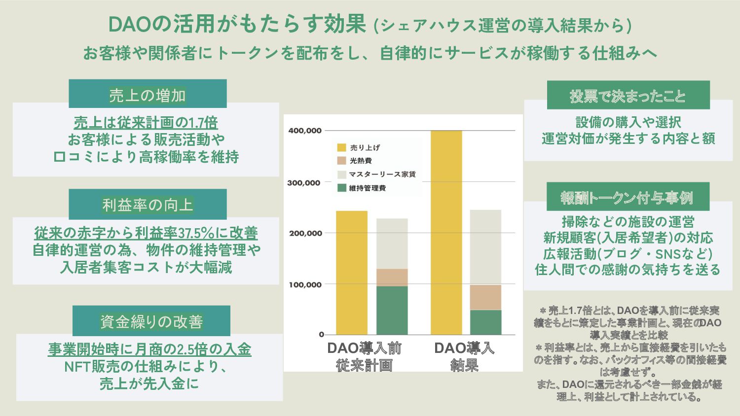利益率の向上 *売上1.7倍とは、DAOを導入前に従来実 績をもとに策定した事業計画と、現在の DAO 導入実績とを比較 *利益率とは、売上から直接経費を引いたも のを指す。なお、バックオフィス等の間接経費 は考慮せず。 また、DAOに還元されるべき一部金銭が経 理上、利益として計上されている。 DAOの活用がもたらす効果 (シェアハウス運営の導入結果から) 設備の購入や選択 運営対価が発生する内容と額 DAO導入前 従来計画 DAO導入 結果 投票で決まったこと 売上の増加 掃除などの施設の運営 新規顧客(入居希望者)の対応 広報活動(ブログ・SNSなど) 住人間での感謝の気持ちを送る 報酬トークン付与事例 資金繰りの改善