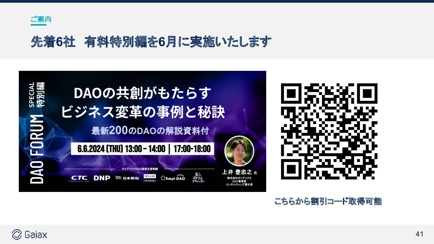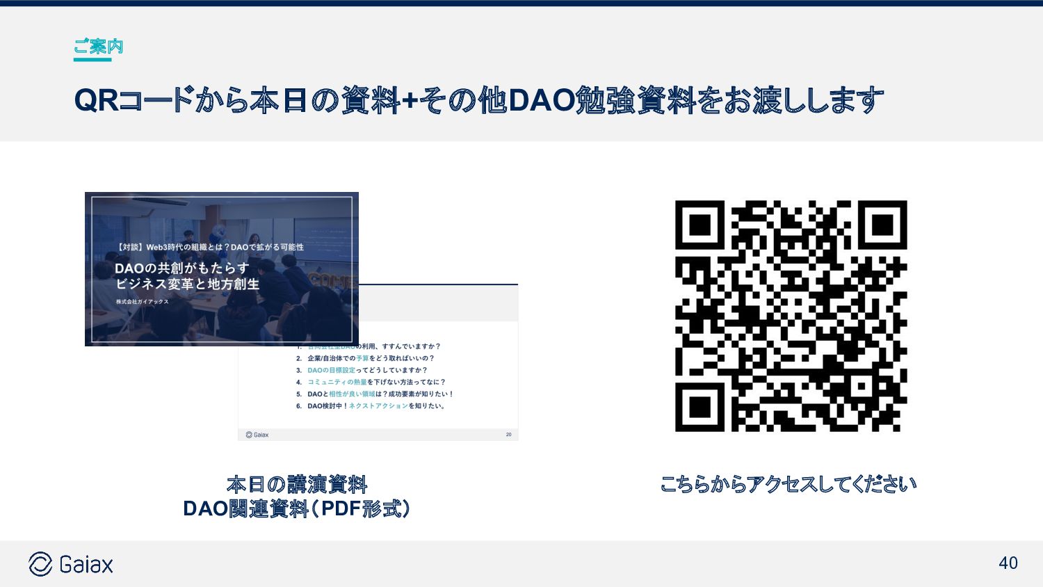 40 ご案内 QRコードから本日の資料+その他DAO勉強資料をお渡しします こちらからアクセスしてください QRコード 本日の講演資料 DAO関連資料(PDF形式) 資料イメージ 資料イメージ