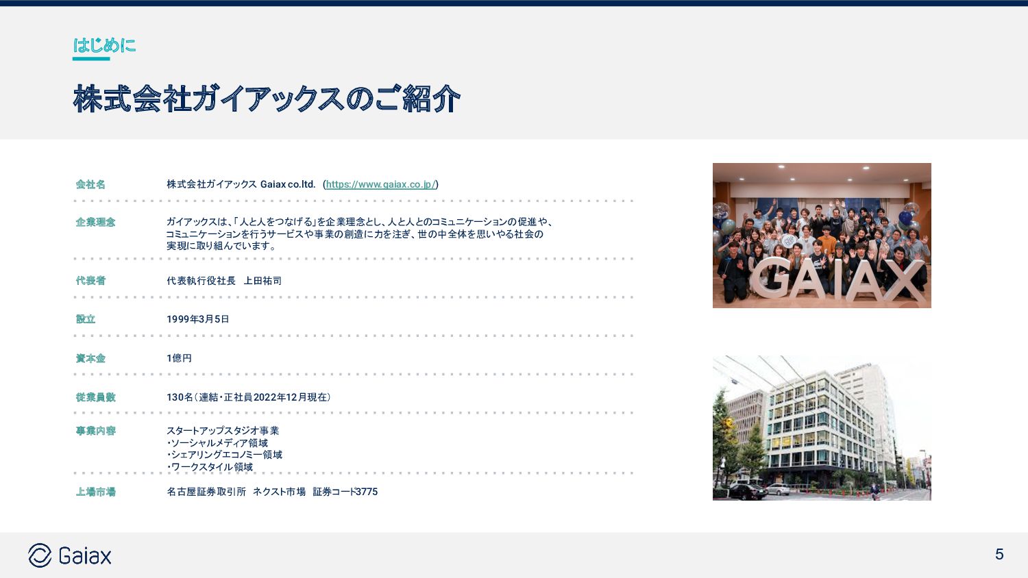実現に取り組んでいます。 代表者 代表執行役社長 上田 祐司 設立 1999年3月5日 資本金 1億円 従業員数 130名(連結・正社員 2022年12月現在) 事業内容 スタートアップスタジオ事業 ・ソーシャルメディア領域 ・シェアリングエコノミー領域 ・ワークスタイル領域 上場市場 名古屋証券取引所 ネクスト市場 証券コード3775