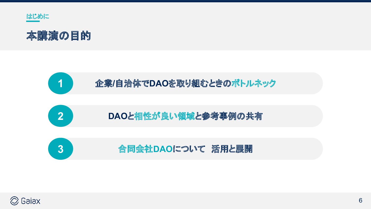 6 はじめに 本講演の目的 企業/自治体でDAOを取り組むときのボトルネック 1 DAOと相性が良い領域と参考事例の共有 2 合同会社DAOについて 活用と展開 3
