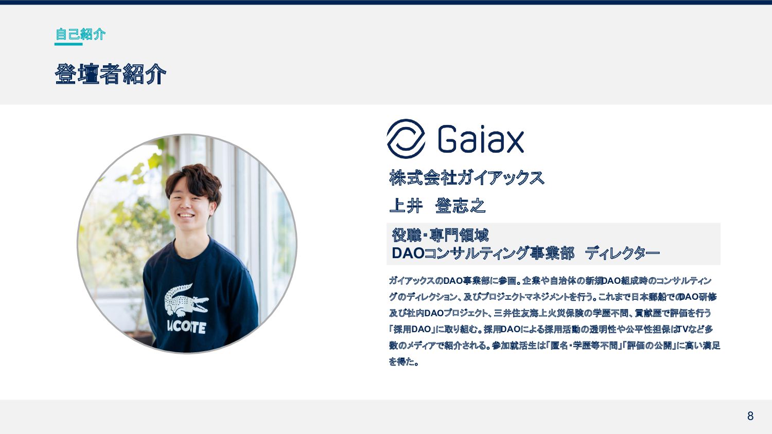8 自己紹介 登壇者紹介 上井 登志之 ガイアックスのDAO事業部に参画。企業や自治体の新規 DAO組成時のコンサルティン グのディレクション、及びプロジェクトマネジメントを行う。これまで日本郵船での DAO研修 及び社内DAOプロジェクト、三井住友海上火災保険の学歴不問、貢献歴で評価を行う 「採用DAO」に取り組む。採用DAOによる採用活動の透明性や公平性担保は