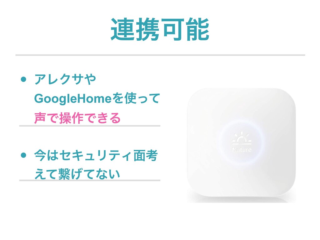 LEAP DAY ࿈ܞՄೳ • ࠓηΩϡϦςΟ໘ߟ ͑ͯܨ͛ͯͳ͍ • ΞϨΫα GoogleHomeΛͬͯ Ͱૢ࡞Ͱ͖Δ