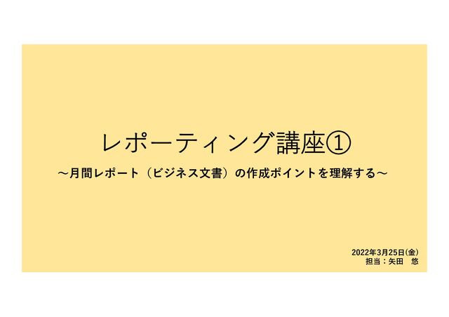 レポーティング講座① 〜⽉間レポート(ビジネス⽂書)の作成ポイントを理解する〜 2022年3⽉25⽇(⾦) 担当:⽮⽥ 悠