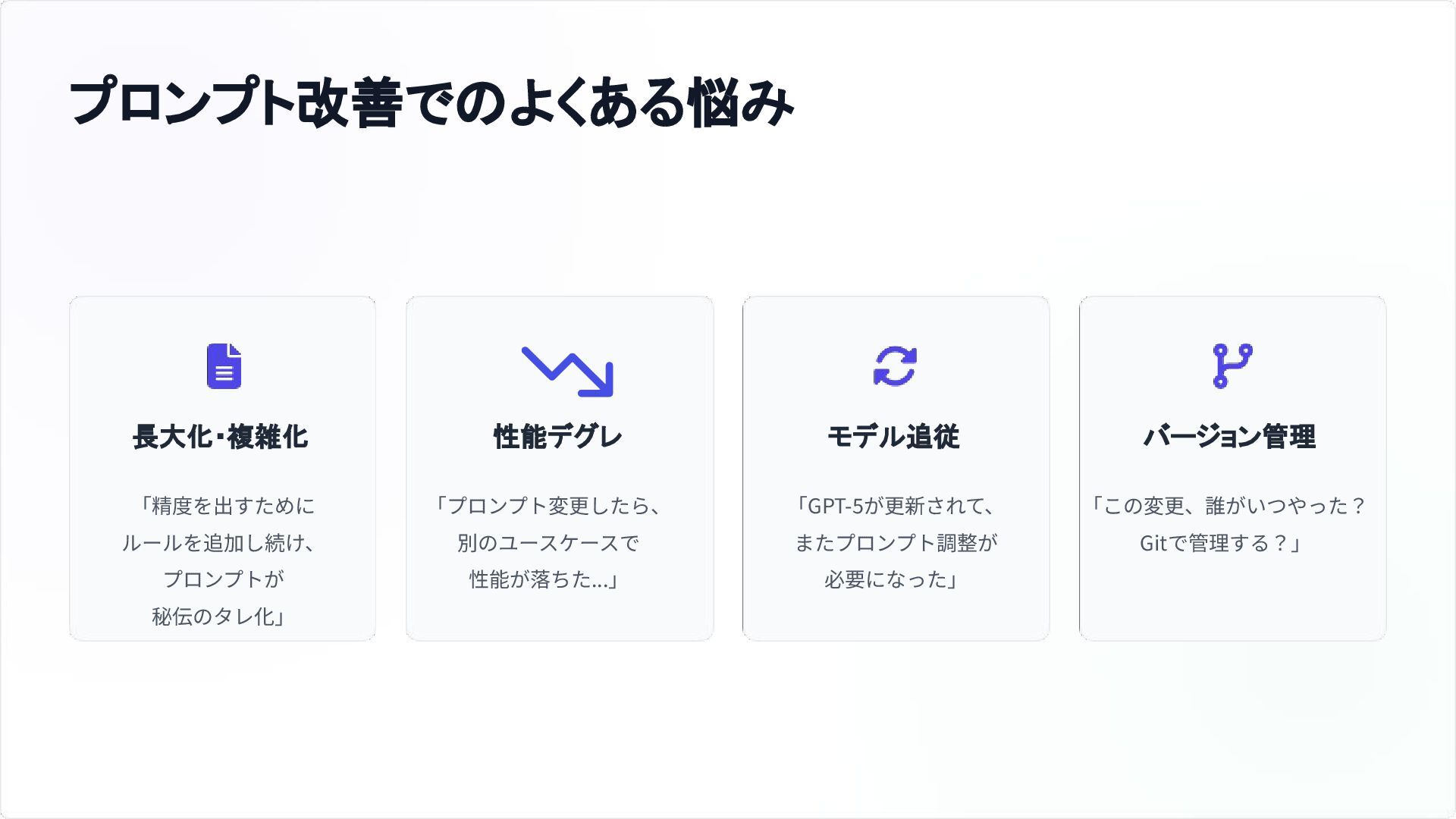「GPT-5が更新されて、 またプロンプト調整が 必要になった」 バージョン管理 「この変更、誰がいつやった? Gitで管理する?」 プロンプト改善でのよくある悩み